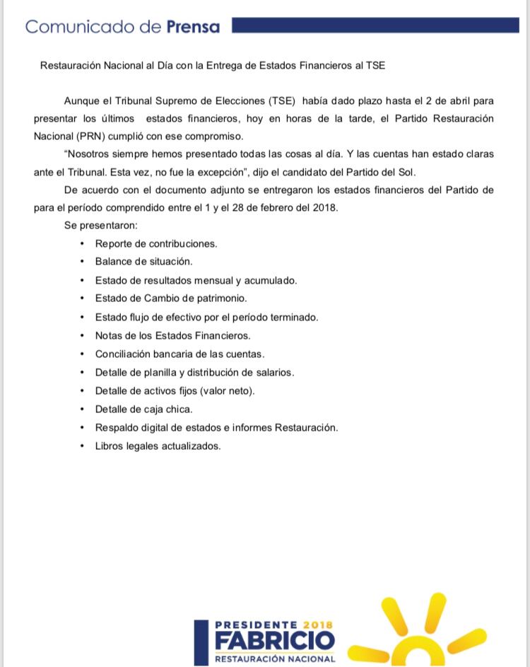Alvarado aseguró que Restauración entregó el reporte de contribuciones, el balance de situación, el estado de resultados mensual y acumulado, el estado de cambio de patrimonio, el estado de flujo de efectivo, notas de los estados financieros, conciliación bancaria de las cuentas, detalle de planilla y distribución de salarios, detalle de activos fijos, detalle de caja chica, respaldo digital de estados e informes y libros legales actualizados.