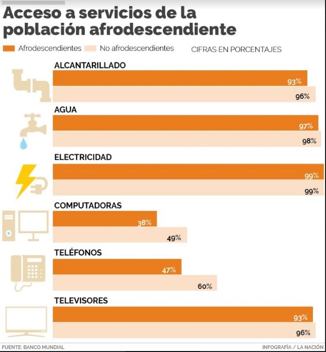 Por ejemplo, en Costa Rica el 93% de la población afrocostarricense tiene acceso al alcantarillado; en el caso de los no afrocostarricenses es el 96% de la población la que tiene acceso.