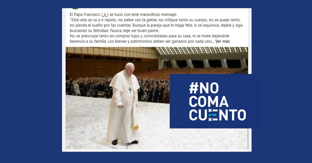 “El Papa Francisco (🙏🏼) se lució con éste maravilloso mensaje. Esta vida se va a ir rápido, no pelee con la gente, no critique tanto su cuerpo, no se queje tanto, no pierda el sueño por las cuentas. Busque la pareja que lo haga feliz, si se equivoca, déjela y siga buscando su felicidad. Nunca deje ser buen padre”, dice una parte del mensaje. El texto no se comparte desde una única publicación, si no que decenas de personas lo han copiado y pegado en sus muros, y cientos más lo reproducen con el botón de “Compartir”.