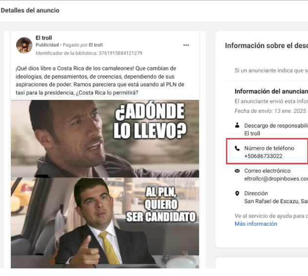 Al buscar los anuncios de El Troll en esta herramienta, se encontró la información que debió suministrar el anunciante como parte del descargo de responsabilidad de la red social. En esta, aparecía que las publicaciones provenían de San Rafael de Escazú y que el número telefónico del responsable era el 8673-3022.