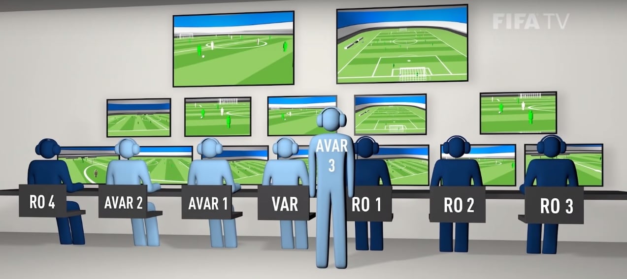 El VAR es el sistema de apoyo que ayudará al árbitro principal en la toma de decisiones. Su rol será el de aconsejar al réferi a lo largo del encuentro, en caso de errores claros o acciones inadvertidas por los jueces del encuentro. El VAR no tiene la potestad de parar el juego, solo puede informar al juez que una jugada debe de ser revisada. En este caso el colegiado tocará su oreja y levantará la mano para informar a los jugadores de la pausa en el juego.