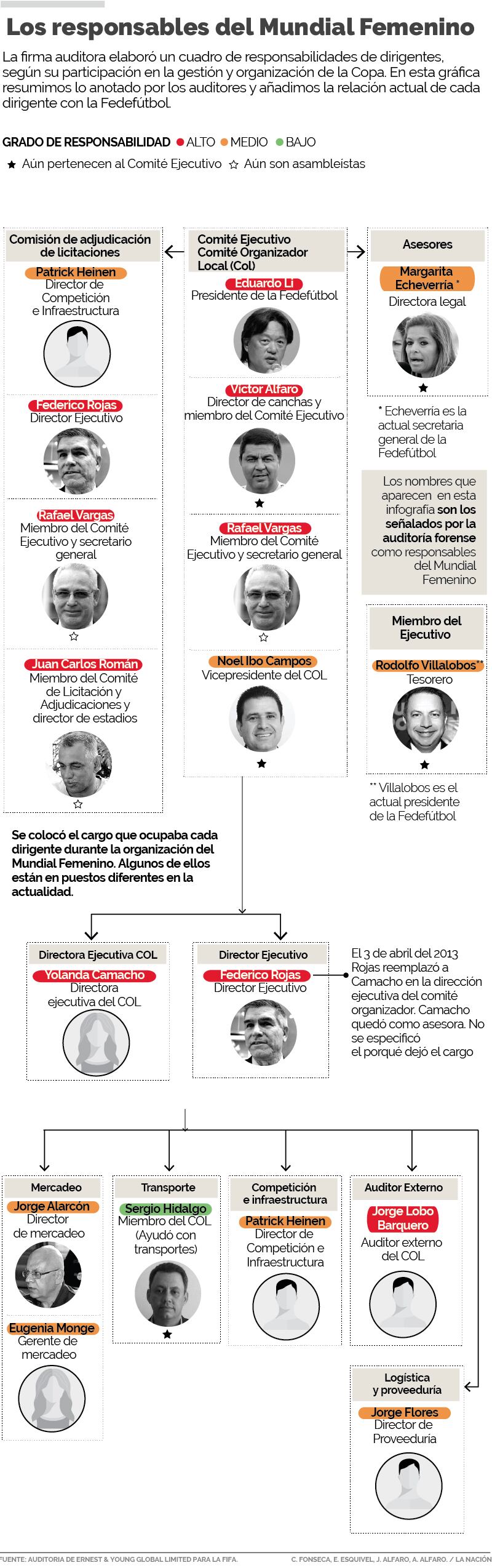 Grado de responsabilidad. Los auditores elaboraron un cuadro de responsabilidades, según la participación en la gestión y organización de la Copa Mundial Sub-17. El informe incluye a varios de los actuales miembros del Comité Ejecutivo de la Fedefútbol y miembros del Comité Organizador del torneo disputado en Costa Rica.