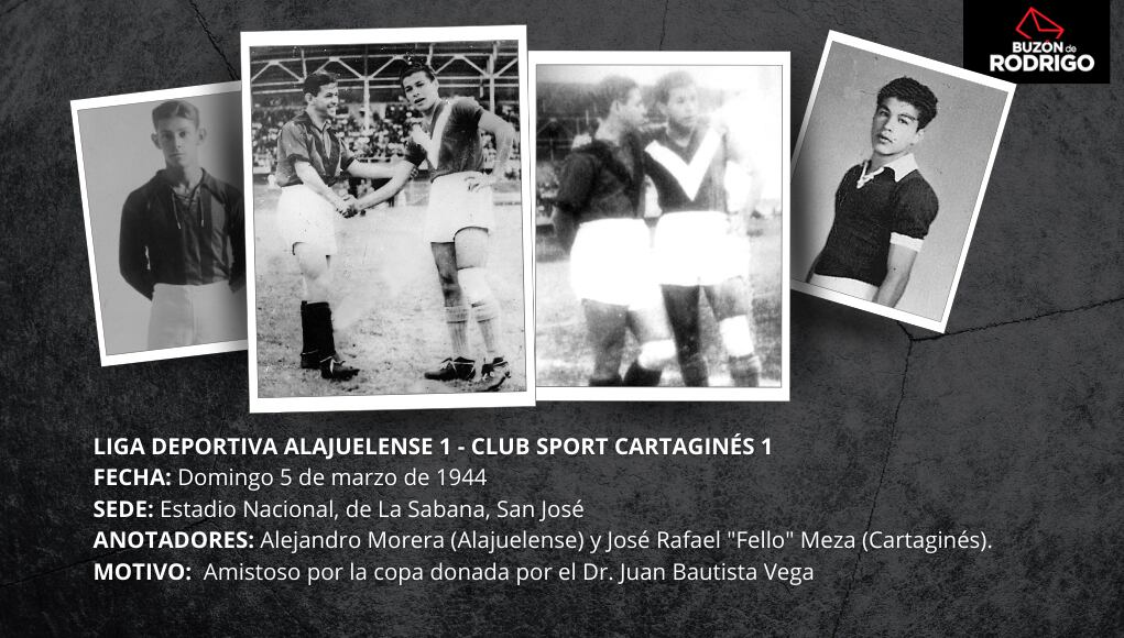 FUENTES CONSULTADAS: Libros “El adiós del Maestro: La historia de ‘Fello’ Meza” (1991) y “Liga Deportiva Alajuelense” (2014), ambos del periodista José Antonio Pastor Pacheco; “Memoria de Liga Deportiva Alajuelense” (1996), de Armando Mórux Sancho; “Cuando el fútbol llegó a Cartago” (1987), de Rogelio Coto Monge; y “Eternamente Cartaginés: El libro histórico de los brumosos en su 114 aniversario, 1906-2021″ (2020), de Andrey Xavier Muñoz Rojas. Diarios “La Nación” y “La Teja” (Costa Rica), así como el Tomo 2 de la serie coleccionable “Huellas del Fútbol Tico” (2009) y el Tomo 1 de libro “Legionarios” (2012), de “La Nación”, dedicado a Alejandro Morera y José Rafael “Fello” Meza, ambos escritos y editados por Rodrigo Calvo. Archivo digital de la Biblioteca Nacional “Miguel Obregón Lizano”, del Sistema Nacional de Bibliotecas, del Ministerio de Cultura y Juventud de Costa Rica. Wikipedia y archivo del sitio web “Buzón de Rodrigo”. Videos de YouTube: Programa “Costa Rica y su Historia”, de Osvaldo Valerín (”Teletica Canal 7″), la Liga Deportiva Alajuelense y el diario “La Nación” (Costa Rica). Fotografías: Archivo de Rodrigo Calvo. Artes: Randall Corella Vargas.