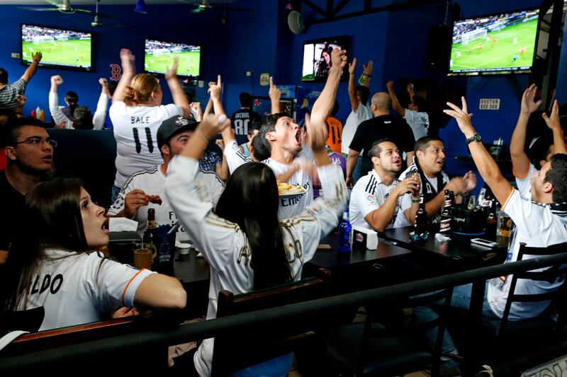 Es martes al mediodía, el Real juega la final de la Súper Copa contra Sevilla. Hay unos 50 seguidores madridistas en Chubbs, casi todos uniformados. Lucen camisas de Casillas, Bale e Isco.