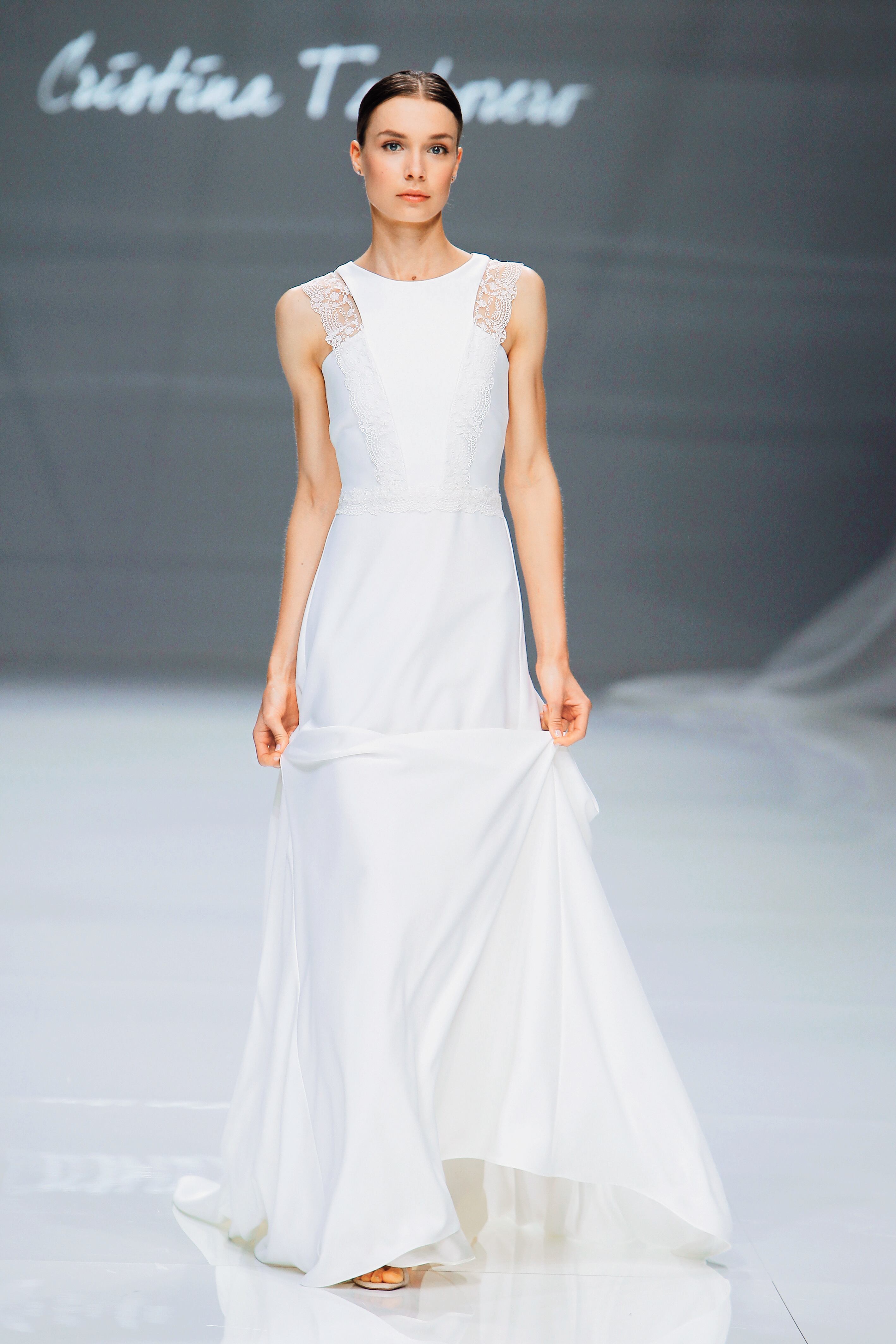 Cristina Tamborero: Volúmenes desde cintura, siluetas que potencian las curvas de la mujer y vertiginosos escotes de espalda. Tejidos vaporosos como la muselina o el crêpe de seda dan vida a cada uno de los diseños inspirados en los rascacielos de Nueva York.