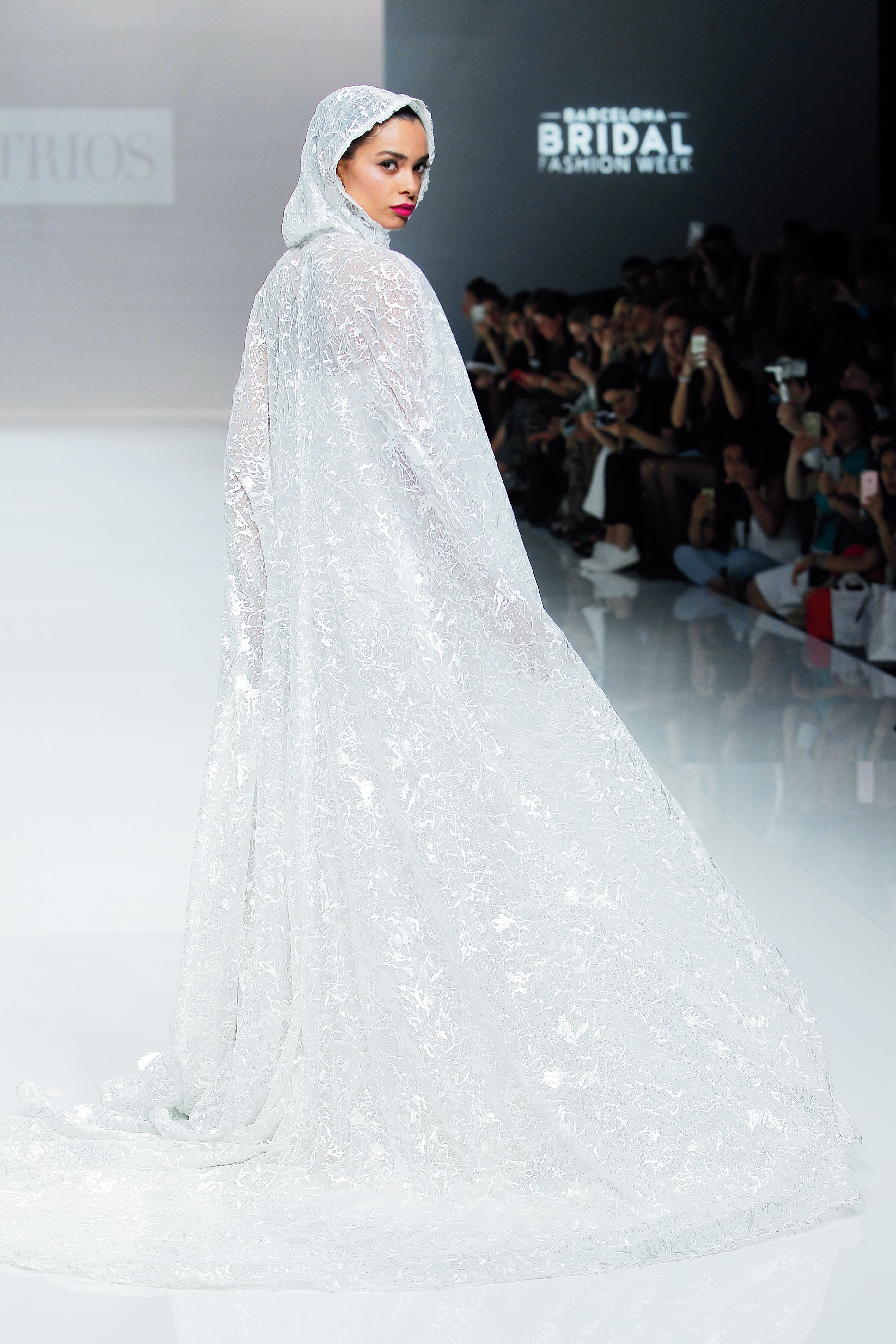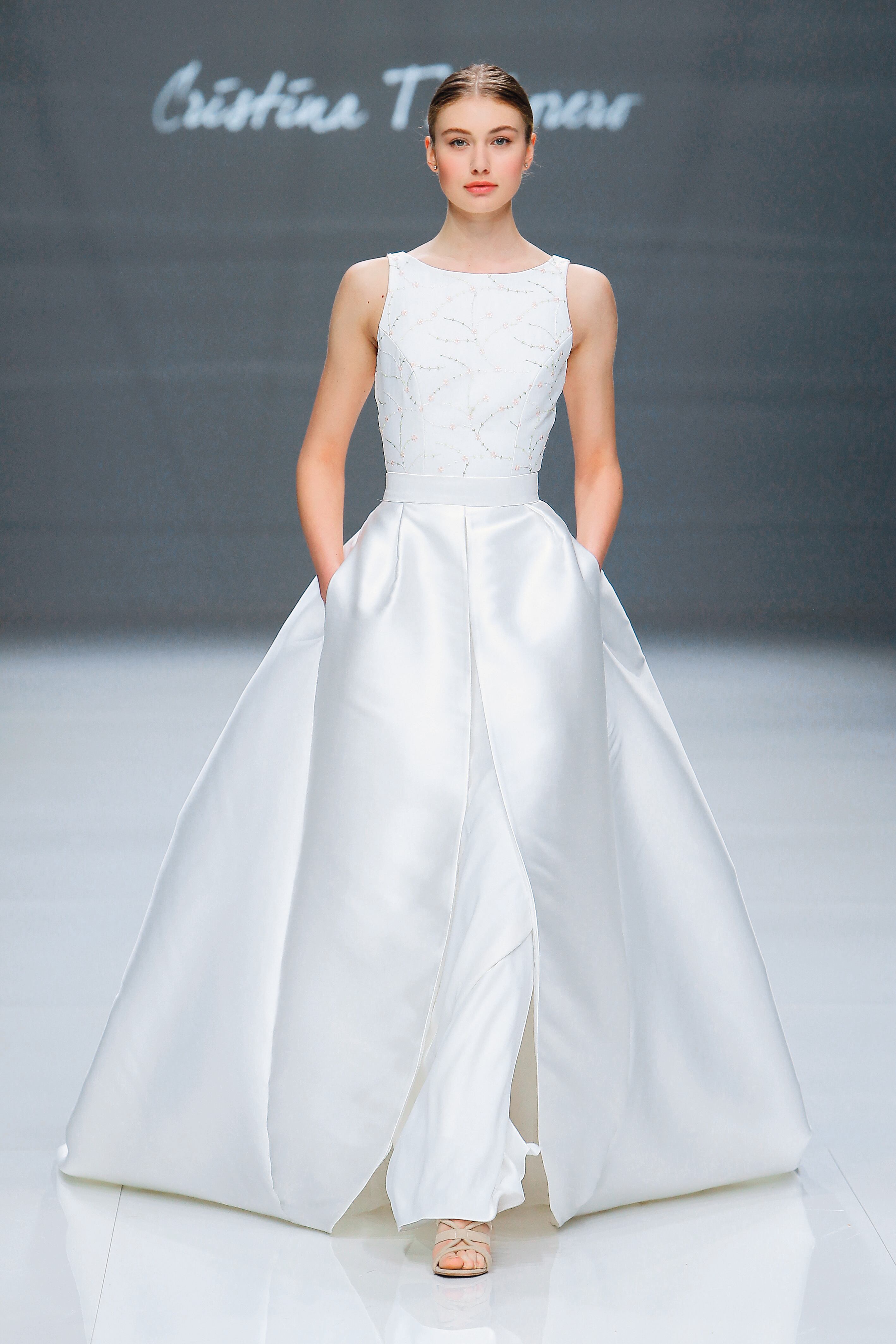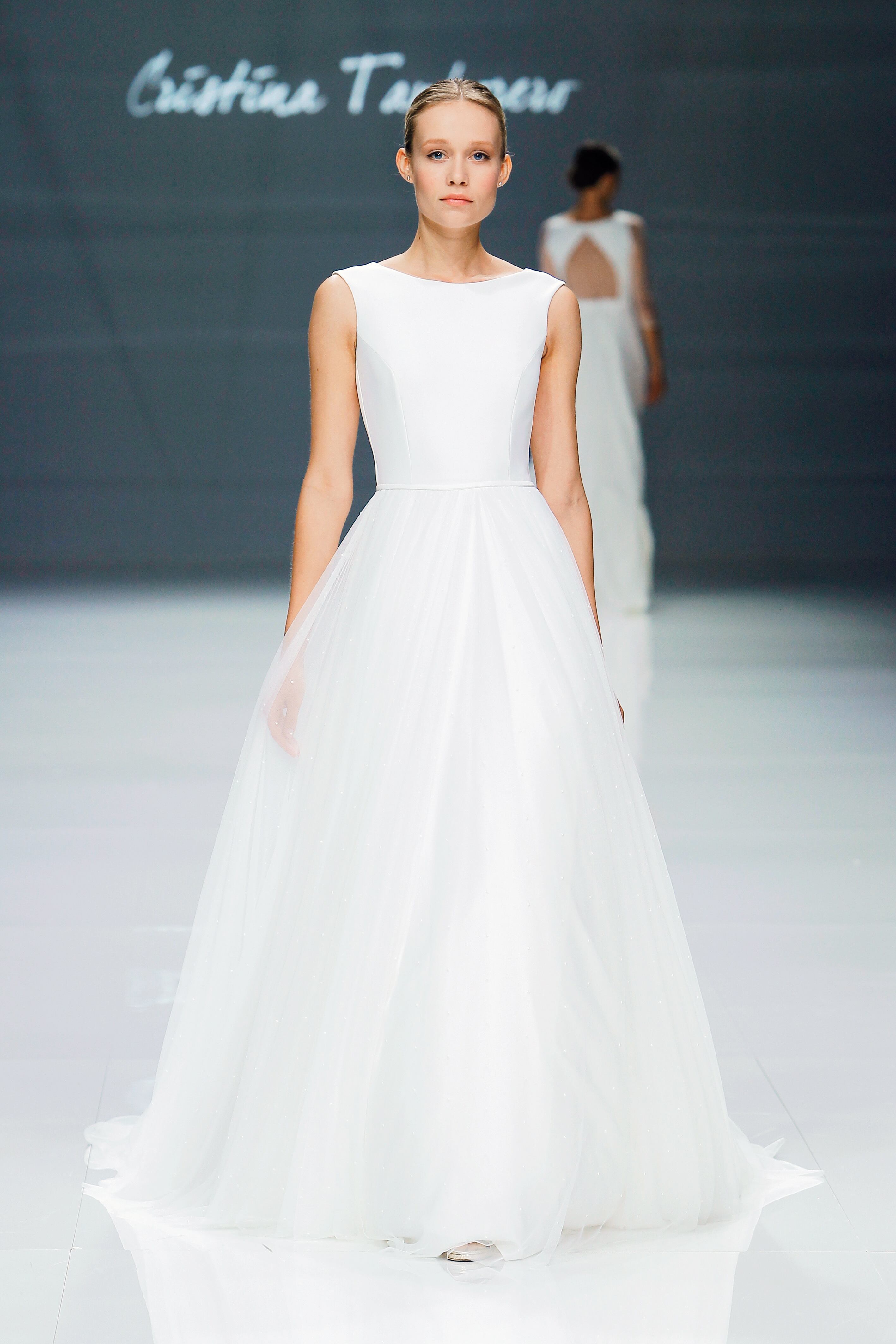Rosa Clará: La tendencia destacada de esta nueva colección son las transparencias que aportan ligereza al look nupcial. Rosa Clará presenta cuerpos lenceros muy estudiados realizados en chantillí sobre bases de tul y organza nude, que se revelan como una segunda piel. Se combinan con faldas de tul, en delicadas capas, que aportan movimiento y vaporosidad.