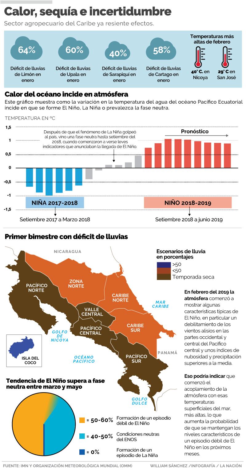 La regla de que El Niño genere inundaciones en Limón se rompe a veces, como ocurrió este año, confirmó. Entre los cinco eneros más secos registrados en el Caribe, cuatro han sido en años con fenómeno de El Niño (1947,1969, 1992 y 1998).