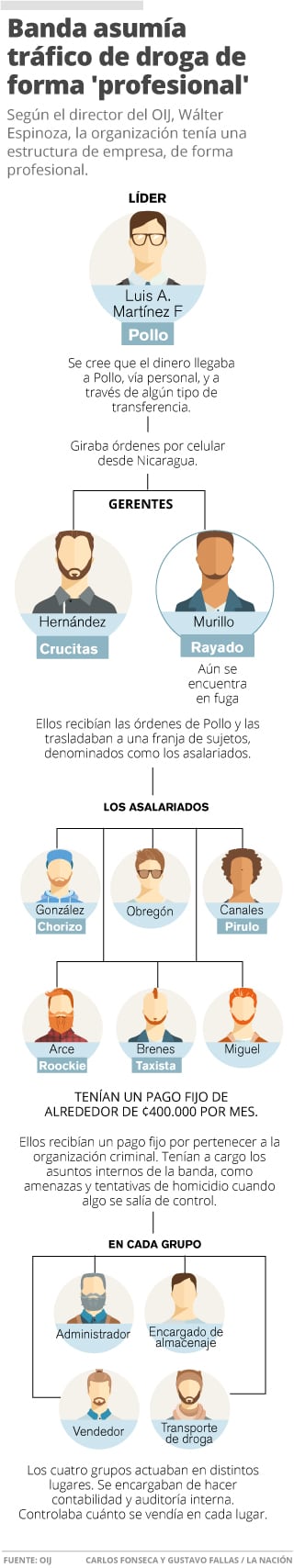 En abril del 2015, la Policía Judicial también había hecho 27 allanamientos para detener a otros 22 miembros de la banda de Martínez, los cuales hoy descuentan penas de entre los 6 y 11 años de prisión por tráfico de drogas. Pese a que en ese momento Pollo ya se encontraba preso en Nicaragua, seguía manteniendo una estructura dedicada a la venta de marihuana y crack en barrios del sur y este de la capital.