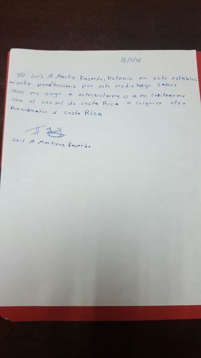 "Yo, Luis Martínez Fajardo, detenido en este establecimiento penitenciario (cárcel nicaragüense La Modelo), por este medio hago saber que me niego a entrevistarme o a encontrarme con el cónsul de Costa Rica o con cualquier otro funcionario de Costa Rica".