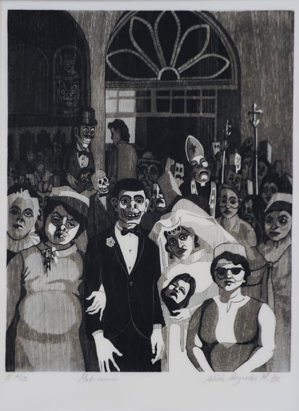 Matrimonio es una xilografía (grabado en madera) alusiva a las mascaradas populares de Barva de Heredia. Esta obra ya adelanta los cruces de motivos que persiguen a Arguedas: la vida y la muerte, la ilusión y la burla, el arte clásico y el popular. Las máscaras son calaveras; las sonrisas, trabajosas. Los planos y los personajes se obscurecen conforme se alejan de nosotros, y no nos gustaría abrazarlos si pudiésemos simplemente levantarnos el sombrero.
