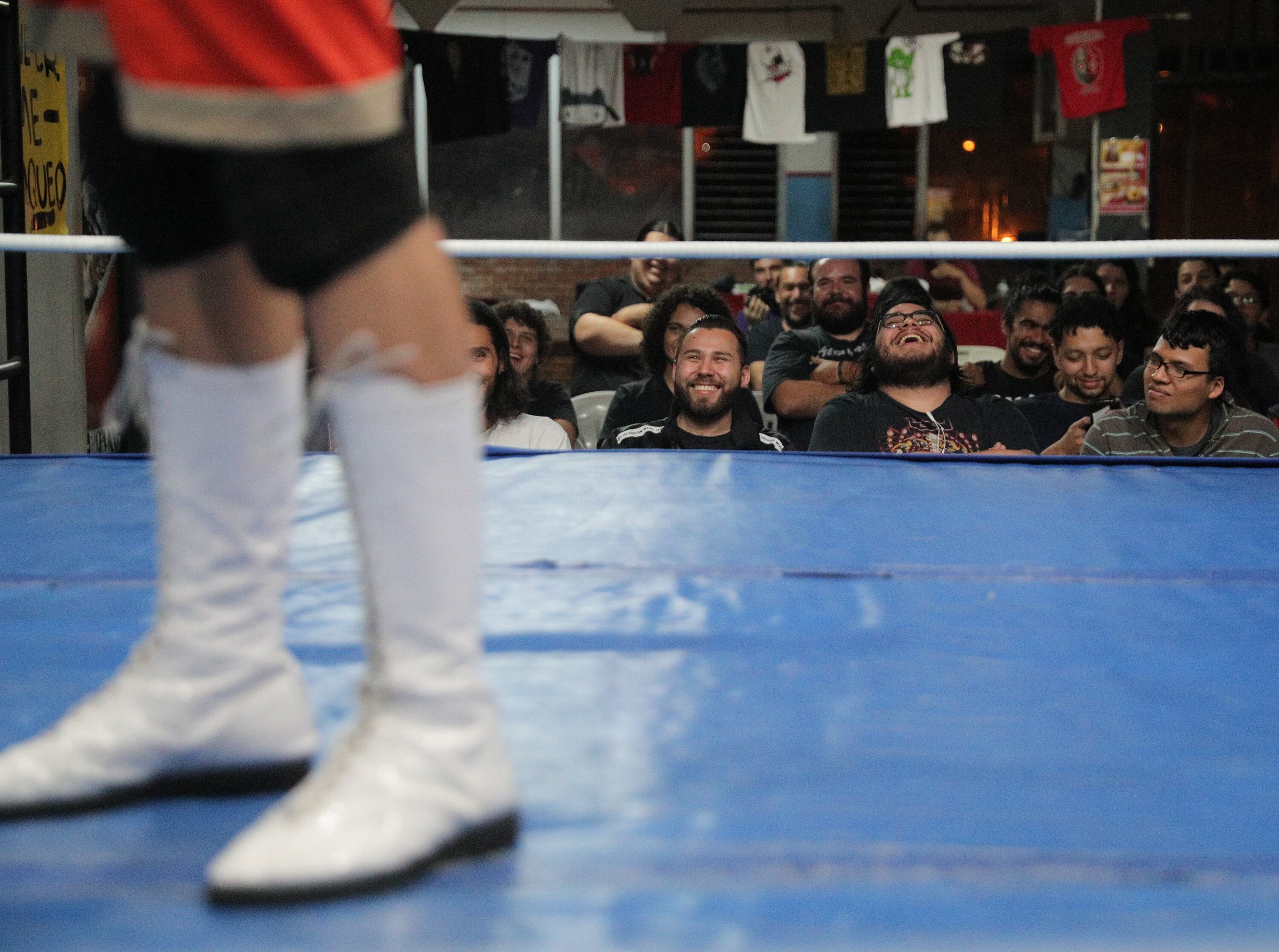 El público se instala en sillas de plástico. Las luces se apagan y la música arranca. Hay aplausos, porra y cánticos, en fin, mucha expectativa. Un proyector muestra el video introductorio de los luchadores Kaiser y Einar.