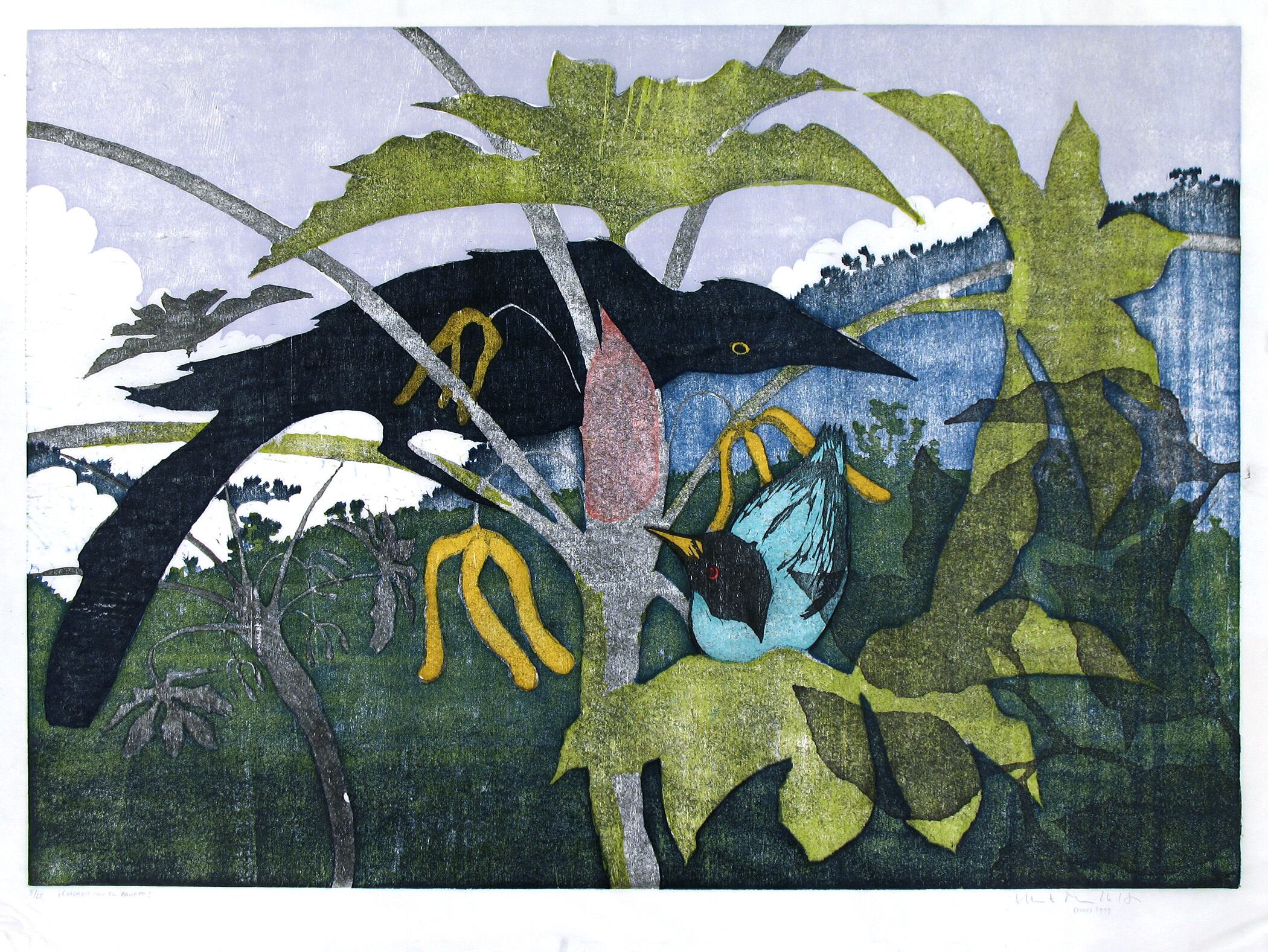 Algunas de las creaciones que muestra con mayor orgullo son aquellas en que llevó la técnica más allá y les probó a todos que es posible obtener resultados que nadie creía. Se destaca el conjunto de piezas acerca de nuestros bosques nubosos, ya que en ellas usó varias matrices para lograr diferentes tonos de negro y de gris, con el fin de darle perspectiva y profundidad. Lo logra –¡y de qué manera!–: el espectador se siente rodeado por esa oscura humedad de un bosque con una tenue luz que se vislumbra a lo lejos, en medio de las copas de los árboles.