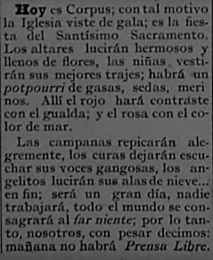 El mismo periódico (28/05/1891), no dejaba pasar por alto la celebración para comunicar que: “Por ser hoy Jueves de Corpus y además feriado, no saldrá mañana este diario”, destacando con ello, una actitud de respeto y consideración hacia la feligresía que se congregaba alrededor de este ritual. Rasgos de este tipo es frecuente encontrarlos en los distintos medios de prensa que cubrían el acontecer social de la capital costarricense y villas de su entorno.