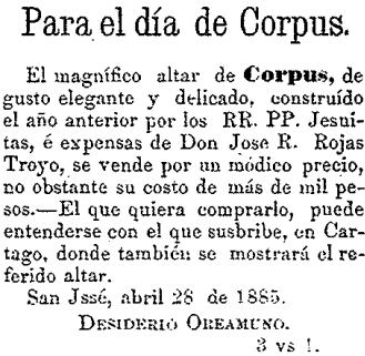 Una crónica del Diario de Costa Rica (26/06/1886) puede resultar de interés particular: “La fiesta del Corpus Christi se celebró aquí de un modo espléndido. Desde muy temprano recorrían las calles, en dirección a los templos, grupos numerosos de niñas vestidas de blanco, que iban a recibir el sacramento de la comunión. Se construyeron alrededor del parque cuatro altares, artística y sencillamente adornados. La procesión empezó a las nueve y se detuvo delante de cada altar. Ofició el señor Obispo Thiel, acompañado por casi todo el clero de la ciudad. La concurrencia fue enorme. Merece especial mención el orden estricto, rigurosísimo que reinó hasta el fin”.