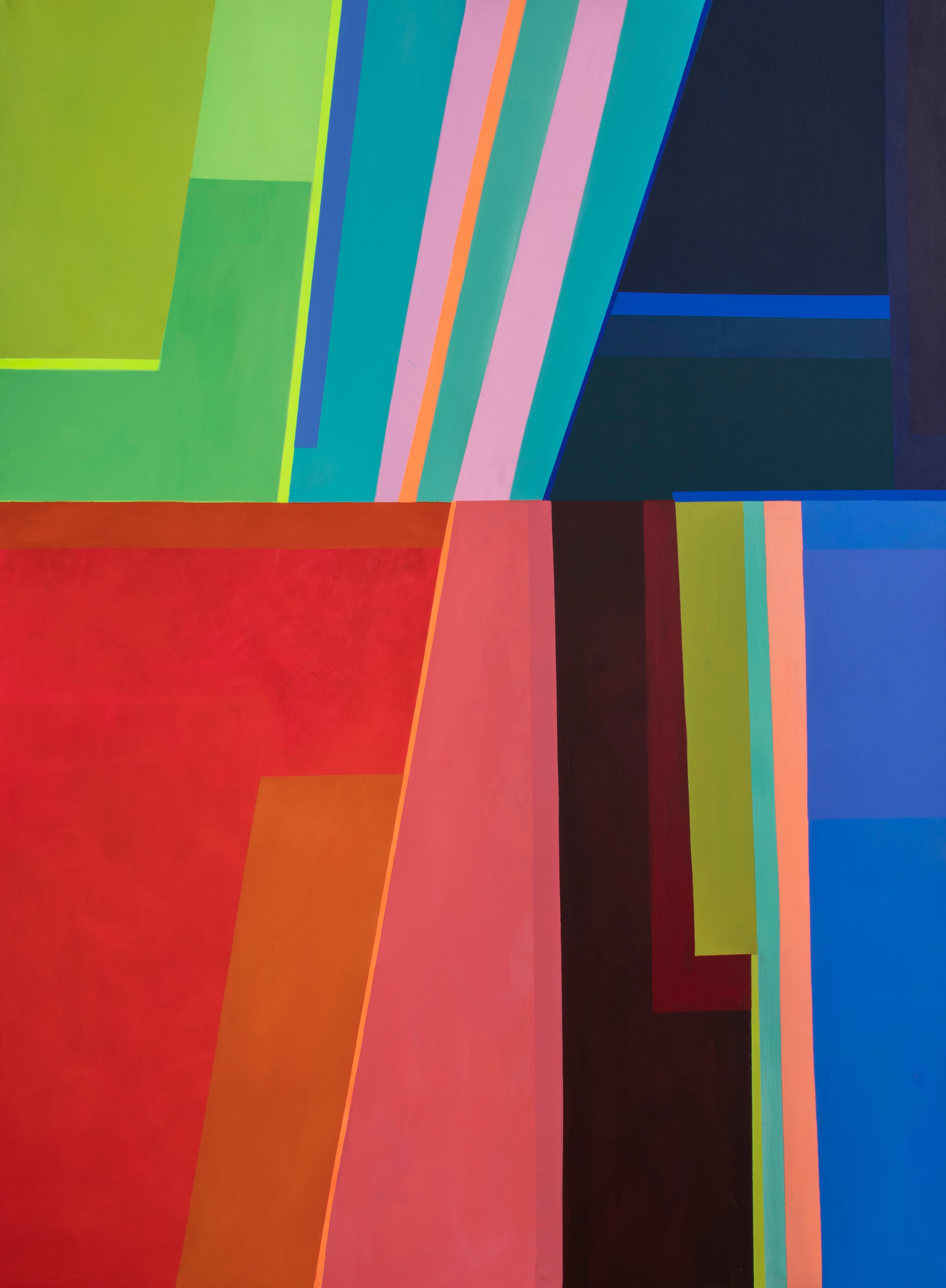 En la exposición que presenta en el Museo Calderón Guardia (del 12 de junio al 12 de julio), esta joven artista confirma estar, yo diría que holgadamente, a la altura del reto. Lo primero que hay que reconocer es que ha logrado formular un lenguaje propio, en el que se expresa con soltura. Ese lenguaje está hecho de formas geométricas irregulares, generalmente de orientación vertical, que se organizan en estructuras ricas y complejas. Esas formas geométricas albergan a su vez una muy amplia gama de colores planos, en tonalidades vivas y luminosas. La animada interacción entre esas formas y esos colores –lo que la artista llama “la articulación de las contradicciones”– es el idioma en que nos hablan sus pinturas.
