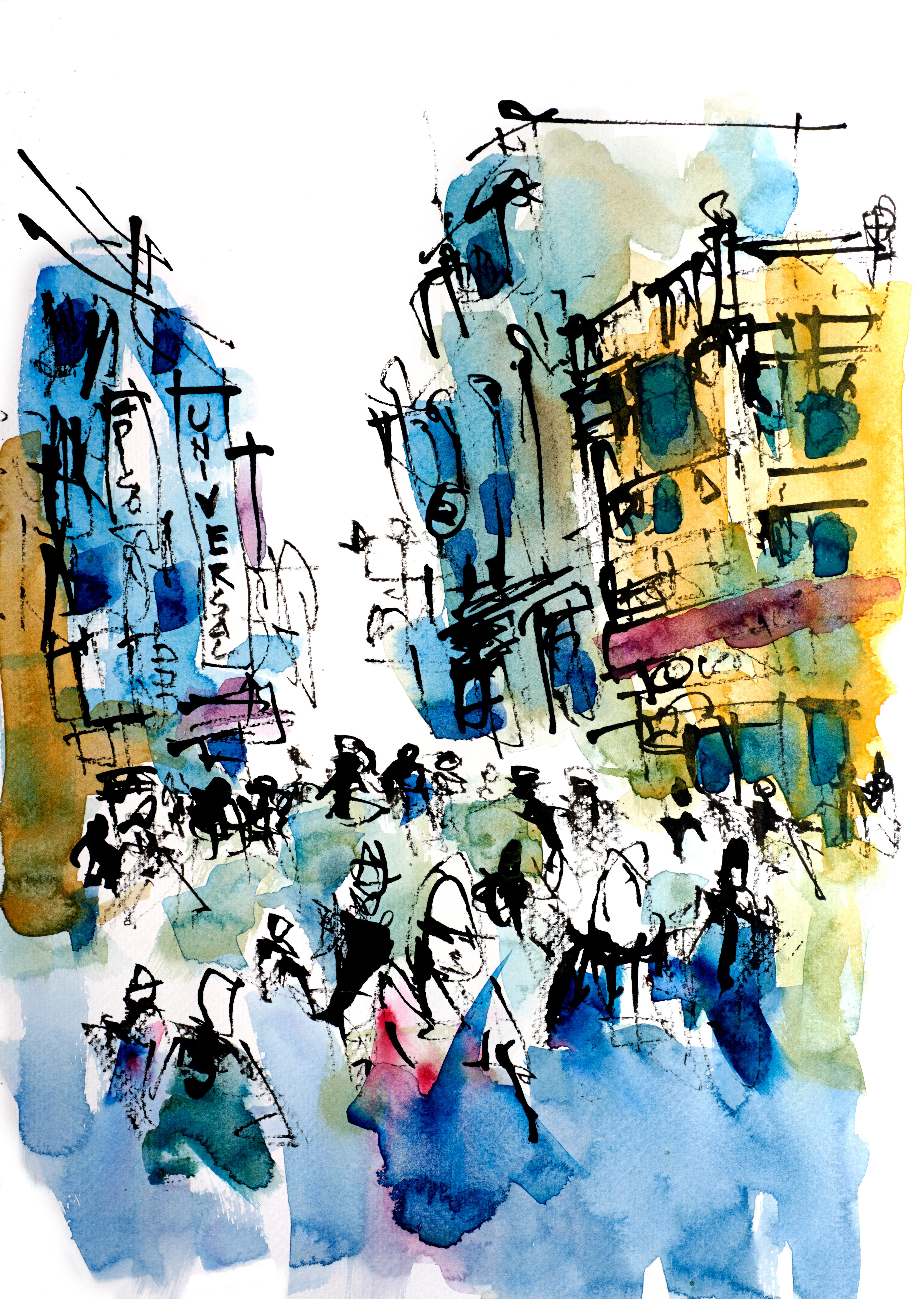 Urban Sketchers ha sido su escuela. En el proceso ha ido desarrollando su estilo. También la rapidez en el trazo, requisito indispensable de todo croquisero urbano.