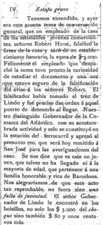 Otro caso de interés ventilado por los periódicos de fines del siglo XIX fue el cambio de un cheque con firma falsificada de la casa comercial Robert Hermanos, acto que fue calificado como “estafa grave”. Un joven extranjero, empleado de esa comercial y “que pertenece a una familia honorable y rica de Barcelona”, logró cambiar un cheque en un banco capitalino, por 3.000 pesos, para luego tomar el ferrocarril a Limón.