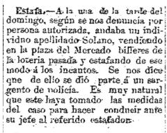 El diario El Comercio (11/01/1887) realizaba una crónica que refleja muy bien esta situación: “Estafa. - A la una de la tarde del domingo, según se nos denuncia por persona autorizada, andaba un individuo apellidado Solano, vendiendo en la plaza del mercado billetes de la lotería pasada y estafando de ese modo a los incautos. Se nos dice que de ello se dio parte a un sargento de policía. Es muy natural que este haya tomado las medidas del caso para hacer conducir ante su jefe el referido estafador”.