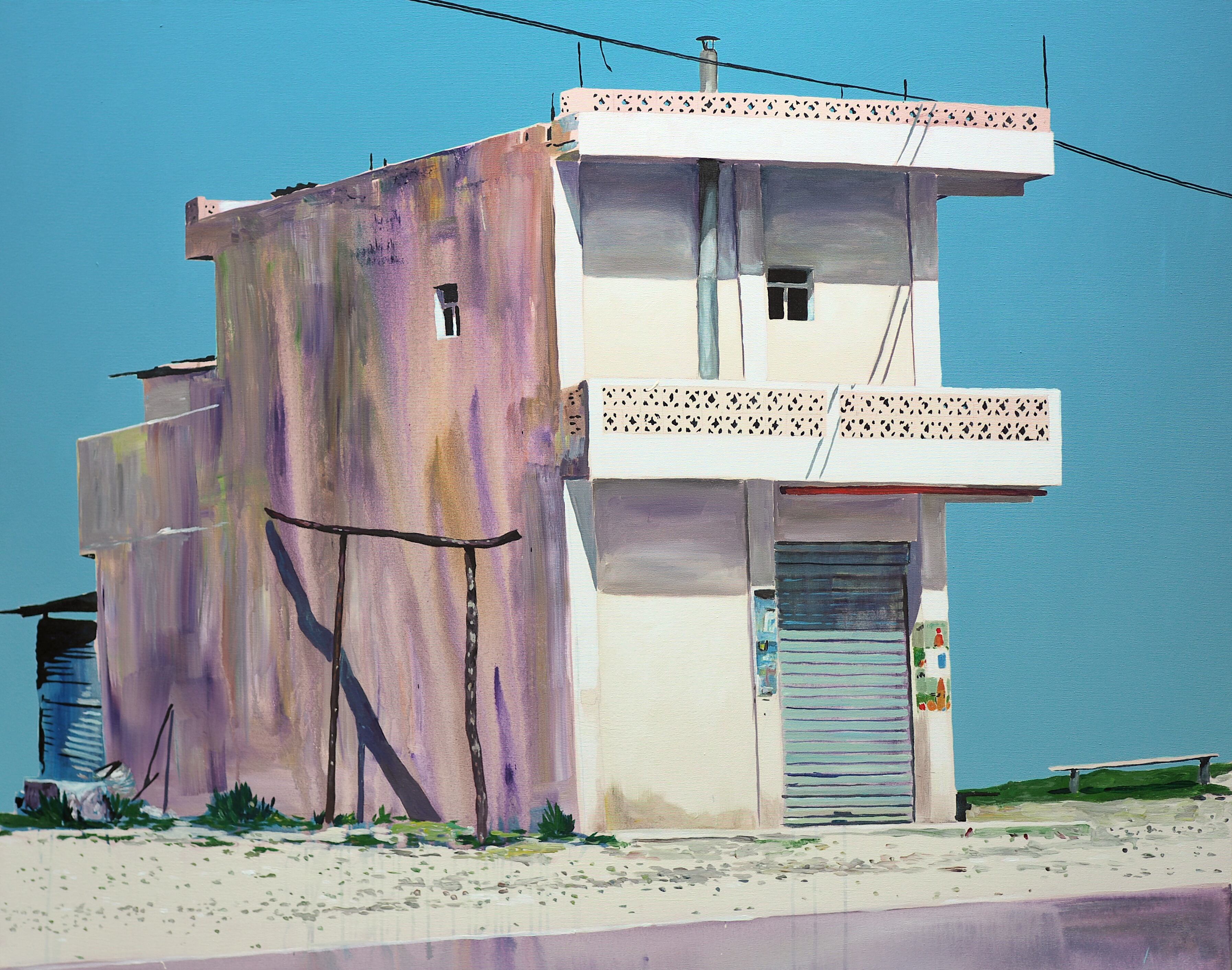 A partir de sus referencias y entendiendo sus múltiples intereses, podernos introducir la segunda obra adquirida por el MAC: Lunes, 30 de mayo, 2016 a las 9:55 am [Panajachel], lienzo en el que presenta la perspectiva de un edificio, donde se distingue su aparente desconexión contextual, una fachada detallada en contraste con una medianera construida con fuertes trazos de color púrpura, en que se destaca un entorno de un celeste absoluto, color que el artista utilizar al igual que el negro para representar el vacío o la ausencia. El ocultar no implica desaparecer o negar; es más, con este gesto el artista logra hacer más evidente la existencia de algo bajo la superficie pictórica.