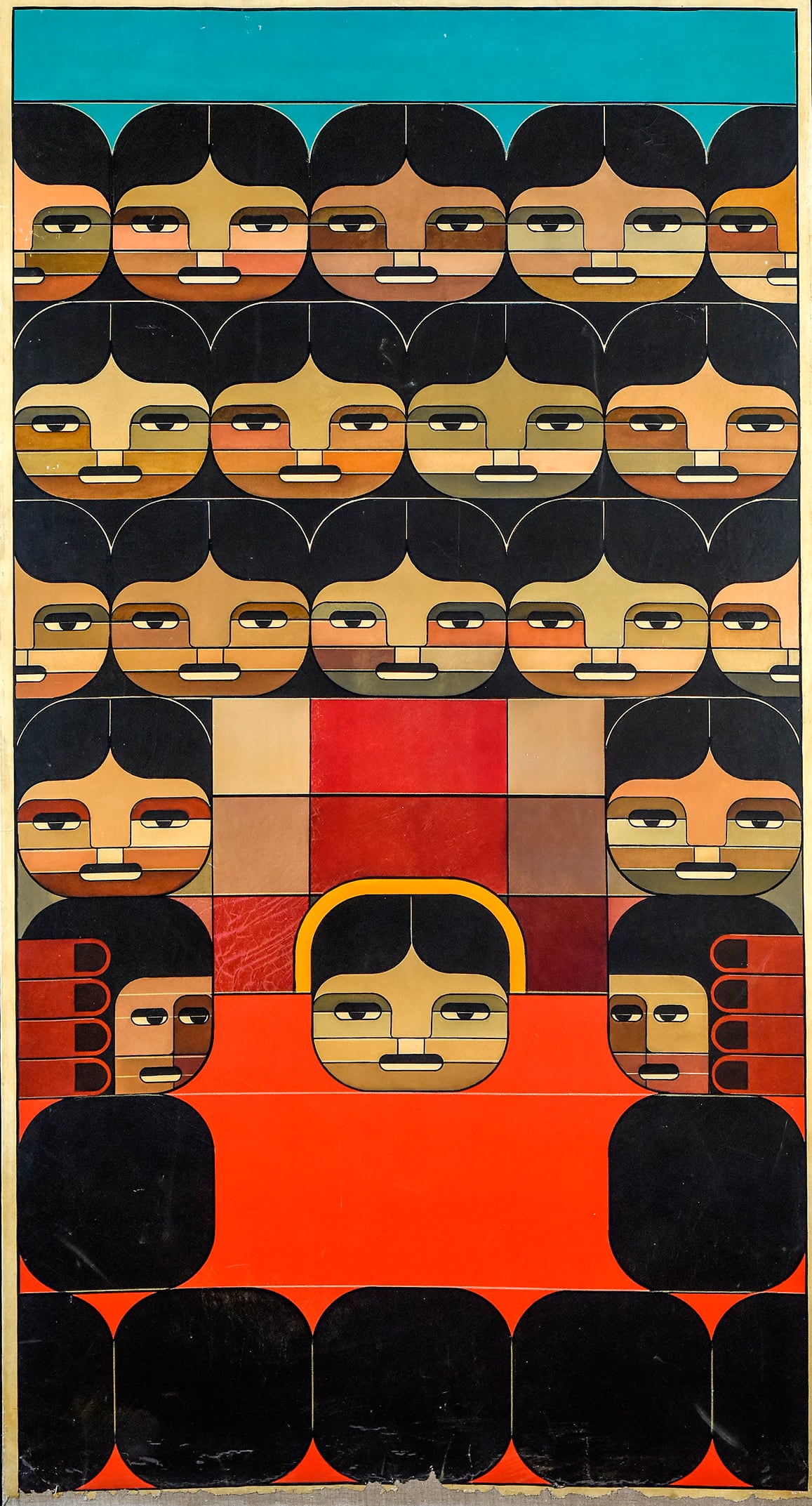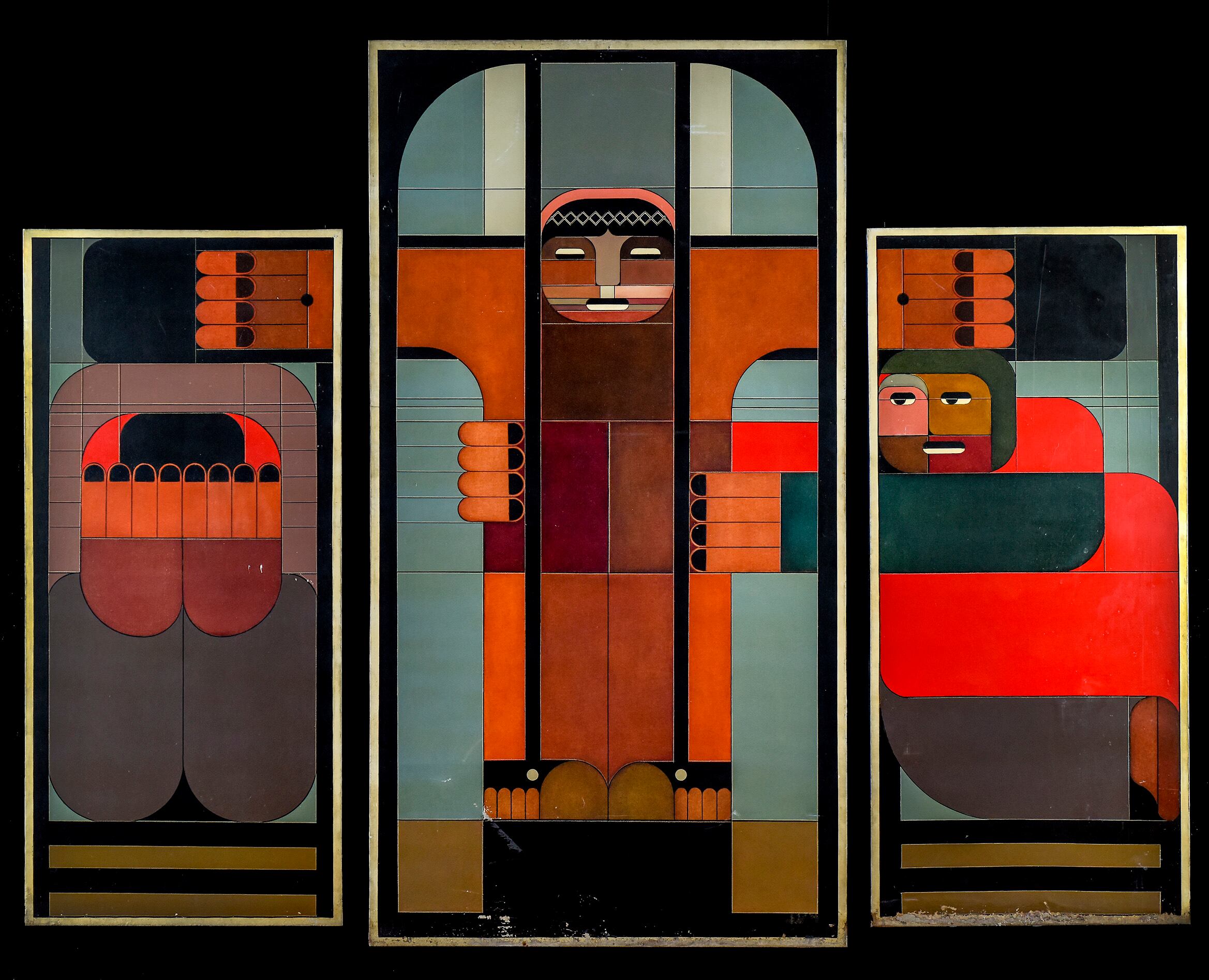 Los rasgos indigenistas de los personajes con ropas coloridas y alegres “narran” la historia del Nuevo Testamento, con María y el ángel de la Anunciación, Jesús recién nacido en el pesebre, la cena con sus 12 discípulos, la crucifixión y resurrección y, como punto final, el Apocalipsis –un cuadro absolutamente negro–.