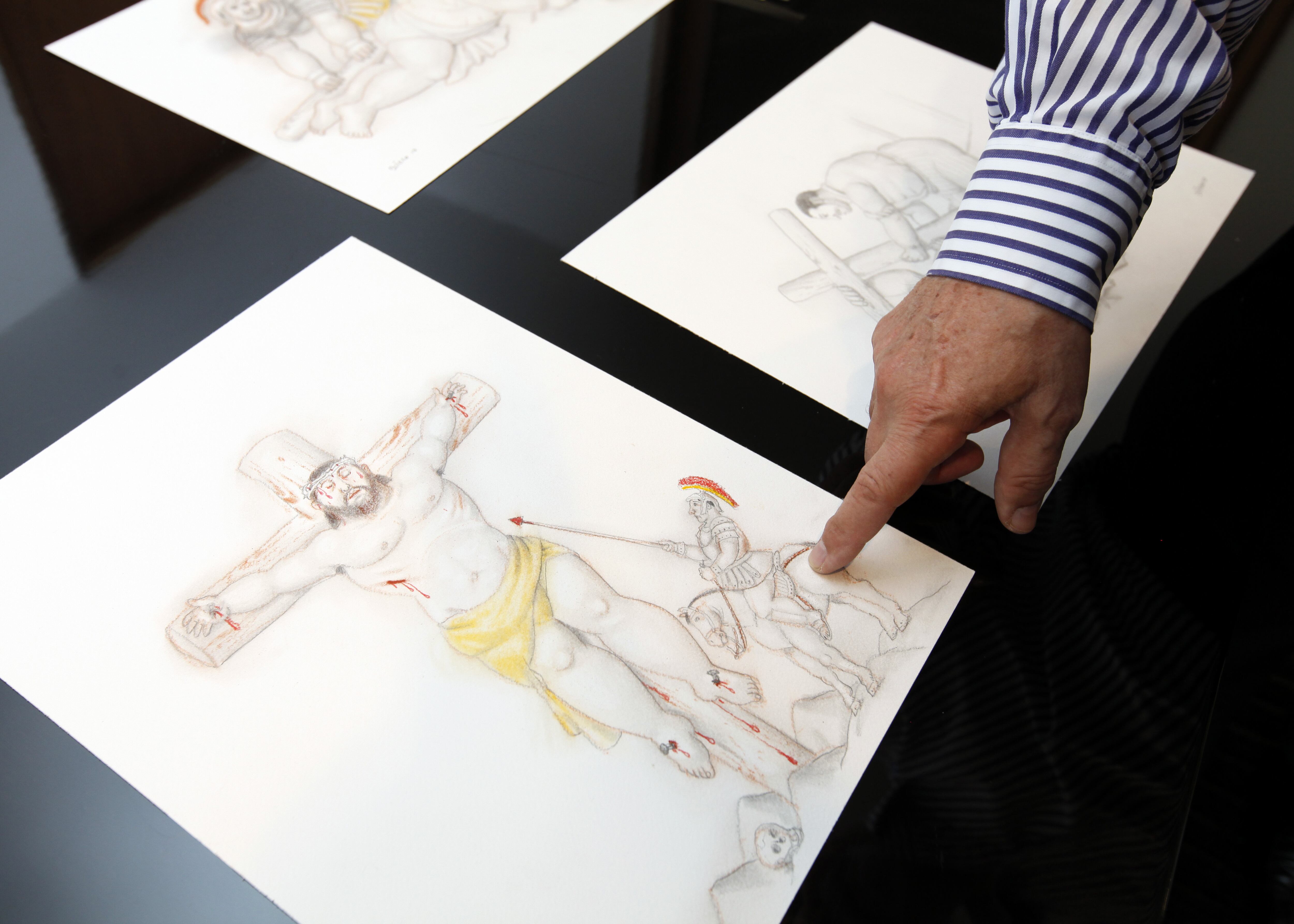 –De todas maneras en lo que es toda la estructura pictórica y la composición de los dibujos del maestro siempre hay un canon de la estética muy claro, que tiene que ver con esos artistas del pasado, básicamente de final del medioevo y el comienzo del Renacimiento. (...) Uno sí podría decir que hay un referente muy claro frente al ícono tradicional en la composición, lo que cambian son las circunstancias atemporales de los personajes. Permanece la figura central del Cristo, los soldados romanos, los judíos, las vírgenes, pero el cambio que él propone es la inclusión de la mujer y el hombre contemporáneos en esas situaciones: un hombre que lleva un reloj o una cadena de oro, que usa jeans, ese tipo de elementos que le cambian a uno la lógica de la estética tradicional.