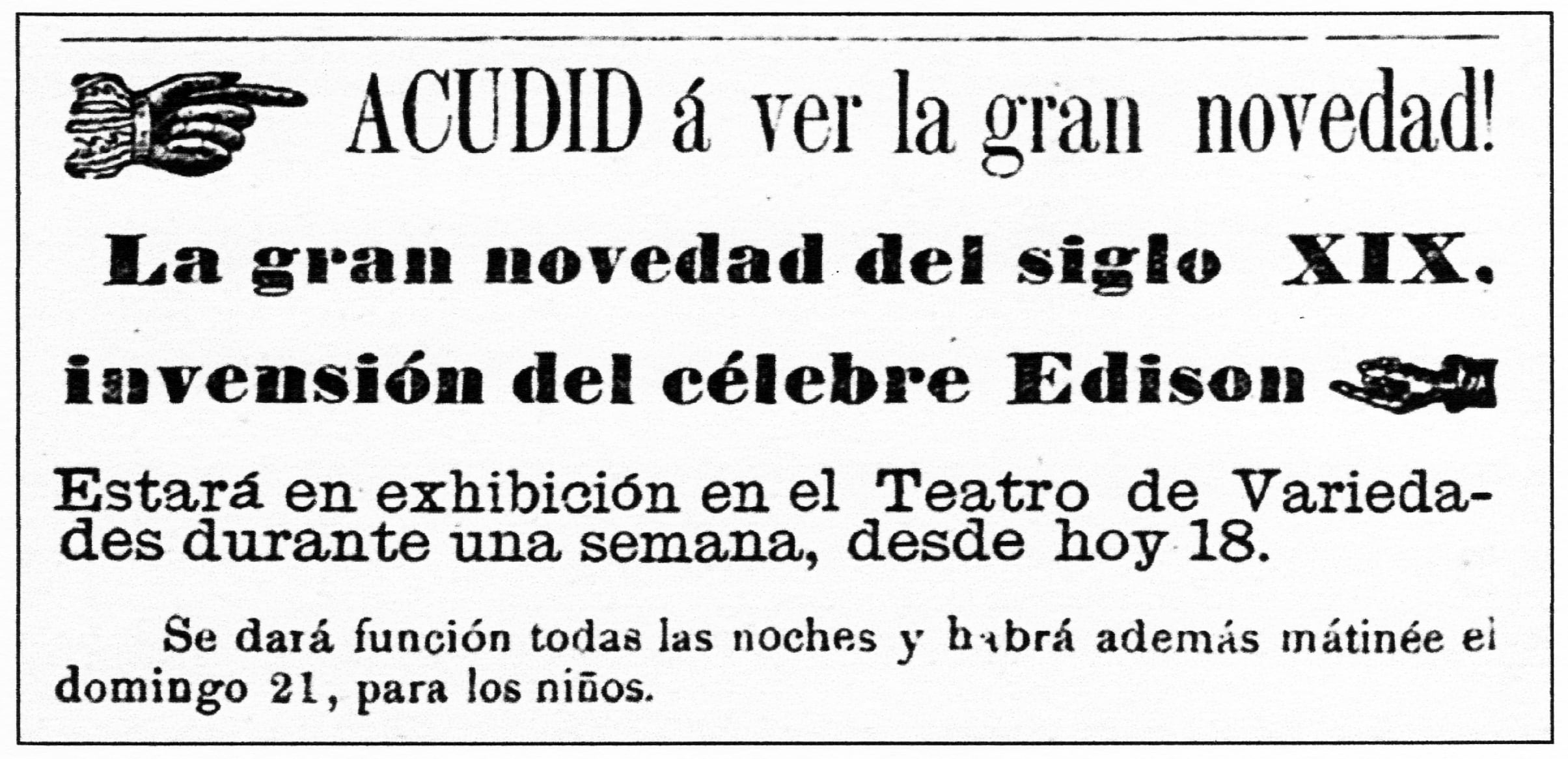 De la misma manera –aunque sin sospecharlo siquiera por entonces– ahí serían testigos, cinco años después, de la atracción que fue calificada como “la gran novedad del siglo”. En efecto, el 17 de febrero de 1897, en una gacetilla titulada Teatro Variedades, el diario La República anunciaba: “Ya llegó la más grande maravilla del siglo 19. El Proyectógrafo de Edison. Seis únicas presentaciones. Primera función jueves 18 de febrero”.
