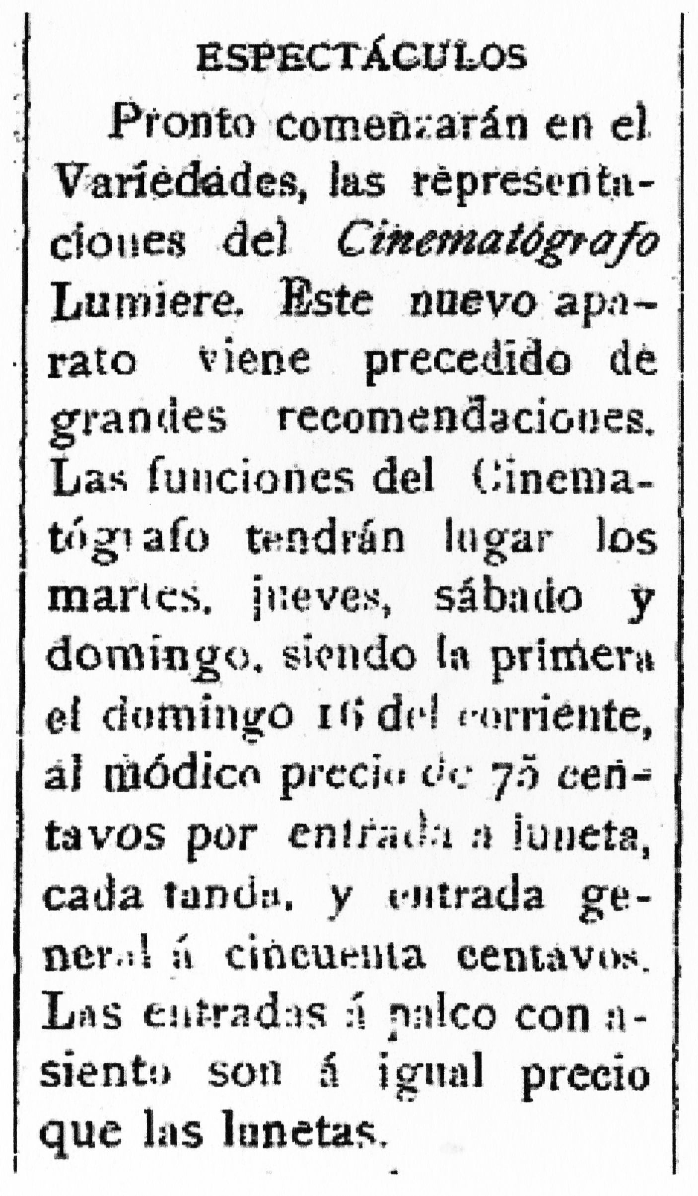 A pesar de lo evocador de su texto se equivocaba el gacetillero, pues en realidad el cinematógrafo había sido estrenado, apenas, el 28 de diciembre de 1895, en el conocido Salón Indio del Gran Café de París; donde se proyectaron, entre otras, las célebres vistas o filmaciones cortas Salida de la fábrica Lumière y la Llegada de un tren a la estación de la Ciotat.