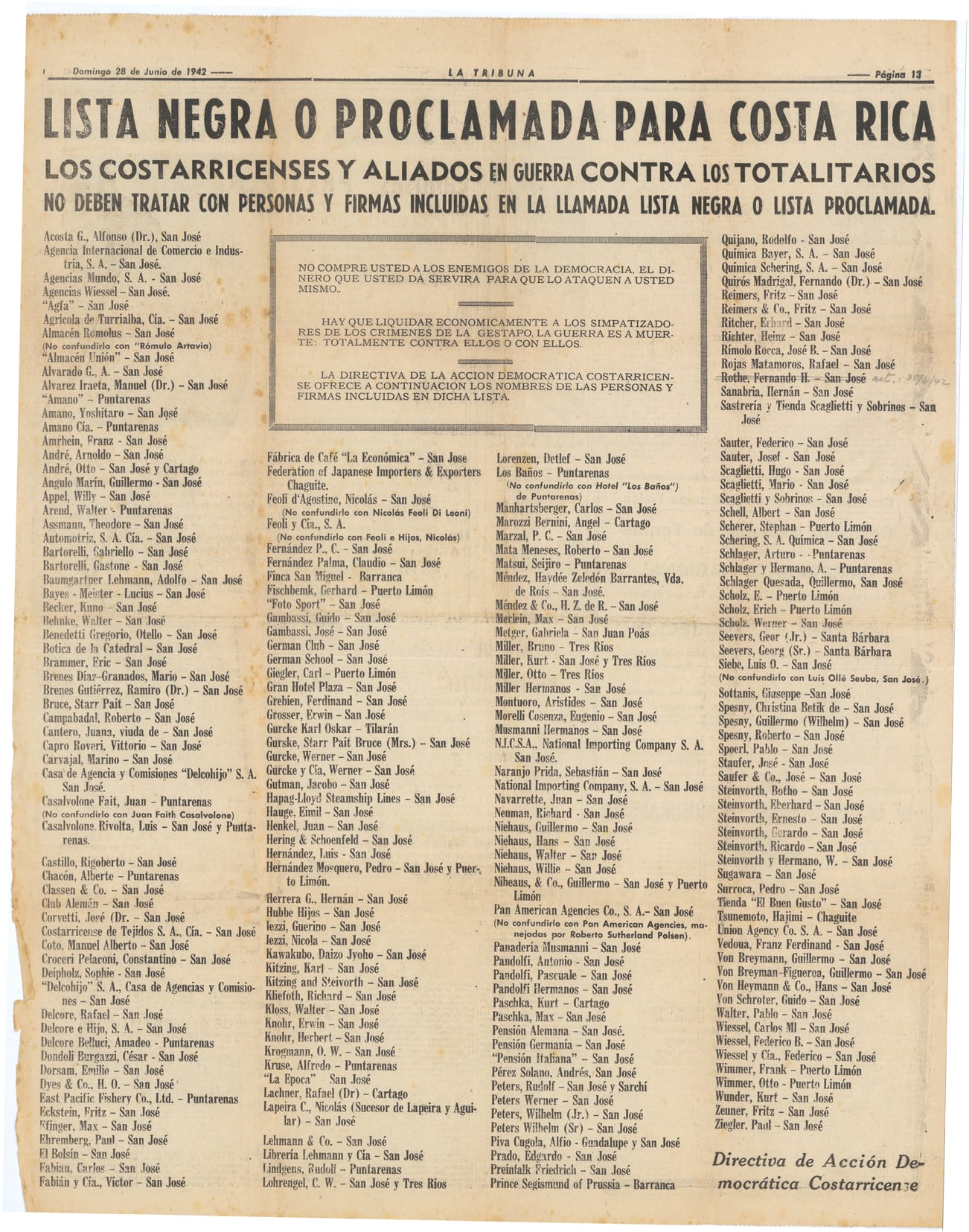 Se dieron a conocer las Listas Negras diseñadas por los gobiernos aliados (Gran Bretaña, Francia, la Unión Soviética y los Estados Unidos) en que se incluían e excluían a personas y empresas como comunicados oficiales del Gobierno de Costa Rica en julio de 1941. De esta forma, el presidente Rafael Ángel Calderón Guardia firmó un acuerdo con Gran Bretaña y Estados Unidos permitiendo la intervención directa de sus representaciones consulares y diplomáticas acreditadas en San José. Para agosto de 1941, el gobierno de Costa Rica concertó con Washington que en su territorio intervendría todas las empresas y el capital de las personas y empresas incluidas en la Lista Negra; incluso, se les inhibió a descendientes de alemanes de su nacionalidad costarricense, sobre todo cuando se sospechaba de una posible adhesión a los regímenes políticos de los países con los cuales se encontraba en guerra Costa Rica.