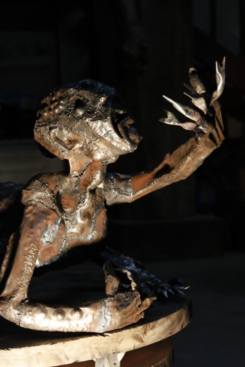 Néstor sigue dando golpes al metal para ablandarlo y dominarlo. Surge, entonces, el caparazón deformado y doliente.
