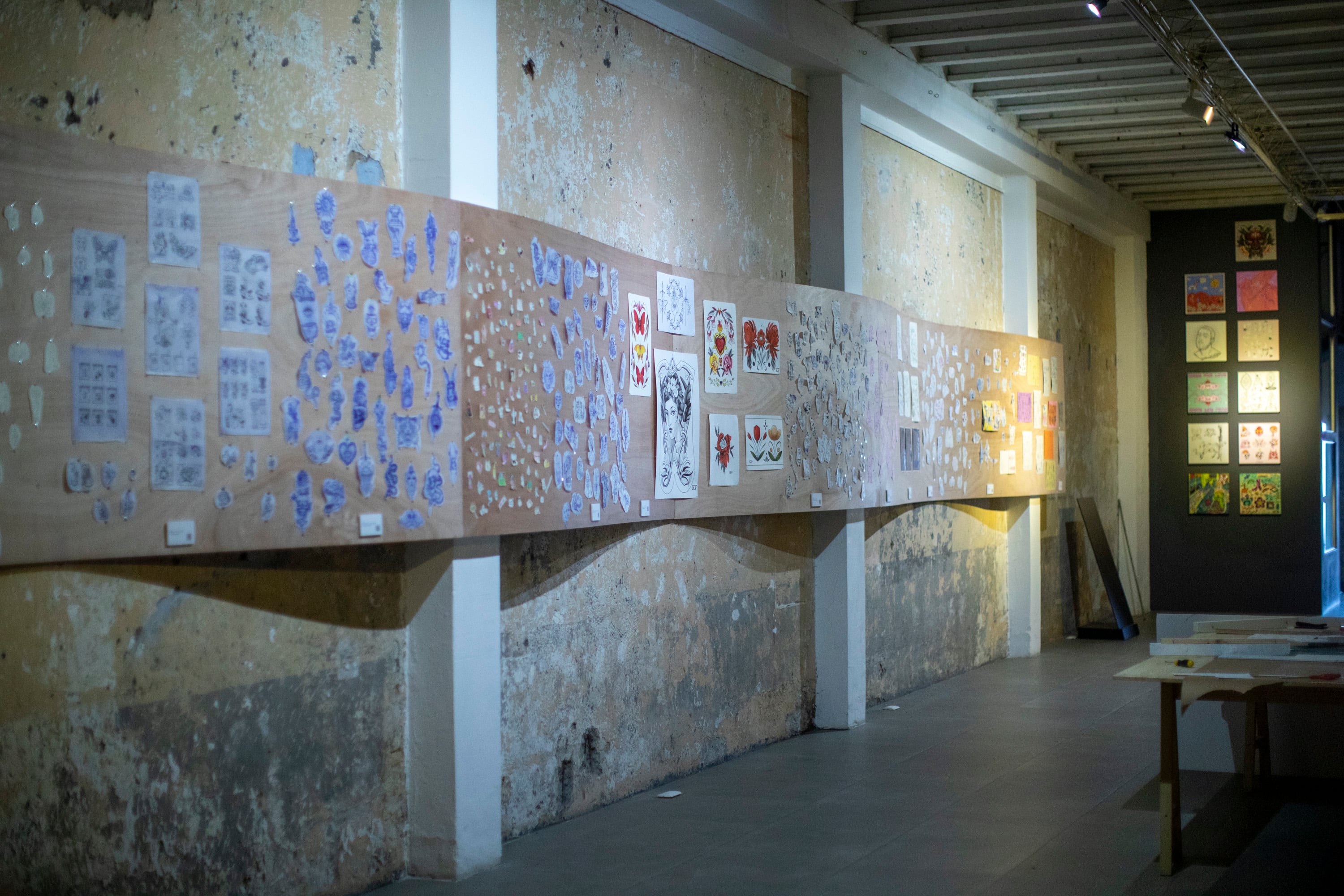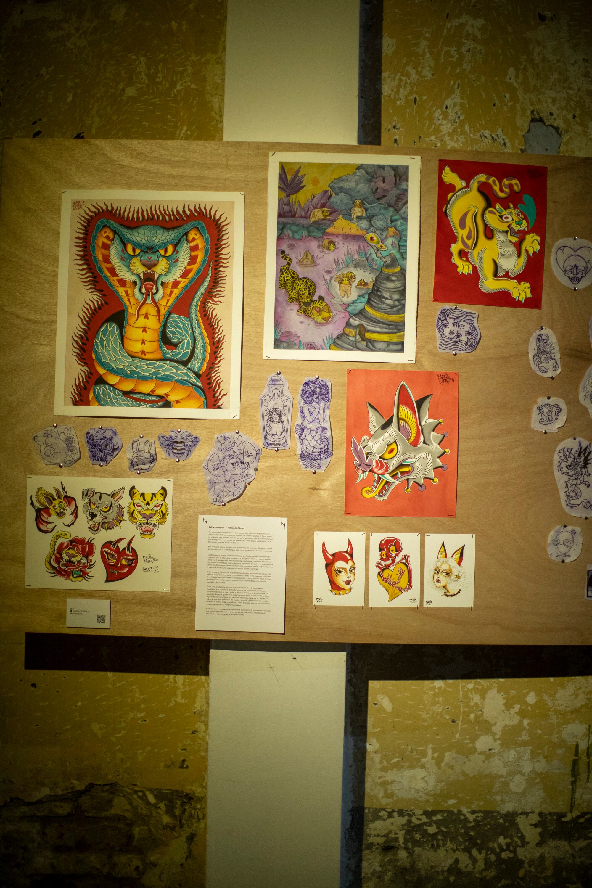 Parte de los diseños de Mariia están al inicio de la exposición en la sala 3, donde se extiende una larga carpeta de trabajos que simula una piel humana. Allí aparecen sus figuras (especialmente animales) y un texto que ella misma escribió, en el que se lee una consigna sobre cómo encontró en el tatuaje una emancipación personal.