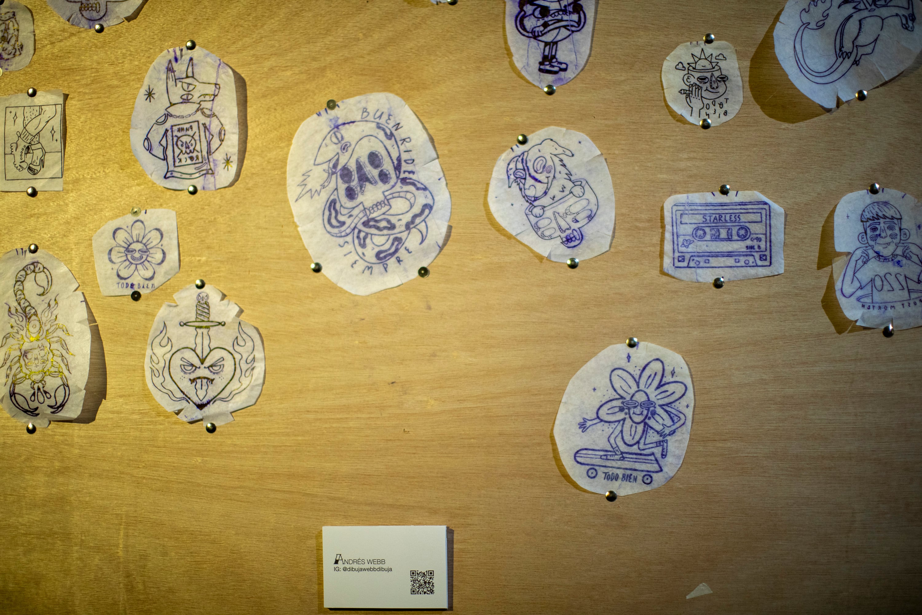 Después de su trabajo, en esta pared se extienden trabajos de todo tipo: hay diseños tribales, japoneses, acuarelas, recreaciones de cultura pop, emulaciones a dibujos de kínder... En fin: se trata de un extenso y diverso catálogo.