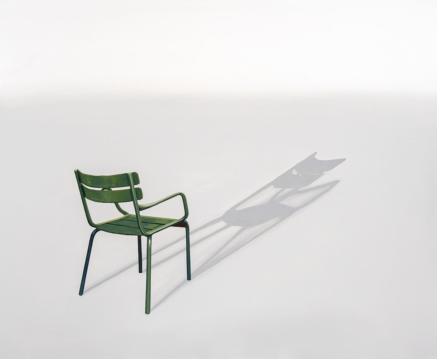 En una de sus series más recientes, la artista aclara su paleta, se aleja de las texturas difusas de las nubes y retoma un nuevo objeto de la realidad visible como tema plástico: la silla de un jardín público. Una silla metálica, verde, a repetición, construye, junto con su sombra sobre un espacio blanco, la totalidad de la imagen.