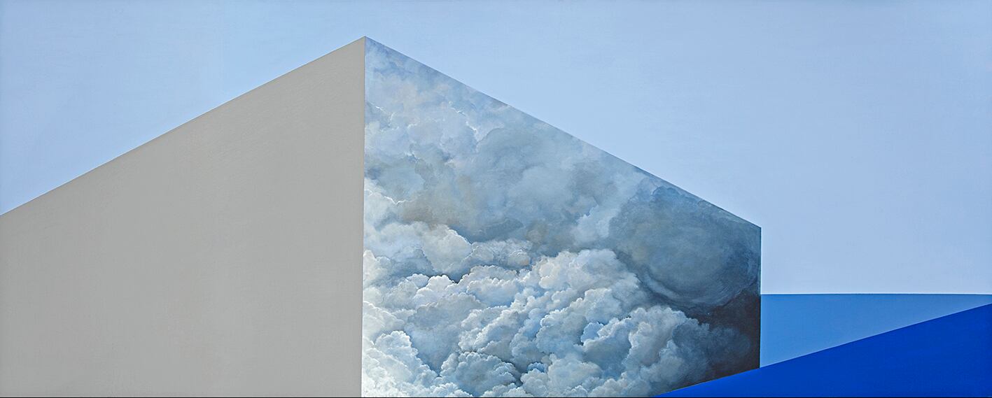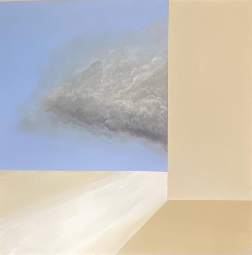 En los grandes lienzos ejecutados entre 2021 y 2022, la pintura se desenvuelve como una particular contradicción, una pugna entre la libertad y la estructura. El paisaje atmosférico funciona como un espacio de tensión y de revuelta, un espacio de destrucción de lo concreto y de reinvención. Las nubes, elemento icónico de su lenguaje plástico, se yuxtaponen a elementos estructurales indeterminados pero rigurosos. Esta pintura es heredera del método surrealista conocido como “afinidades electivas”, desarrollado por Magritte, que consistía en una sola imagen que reunía objetos o conceptos que guardaban una relación, pero cuya yuxtaposición produciría un choque visual dando origen a una revelación en el espectador.