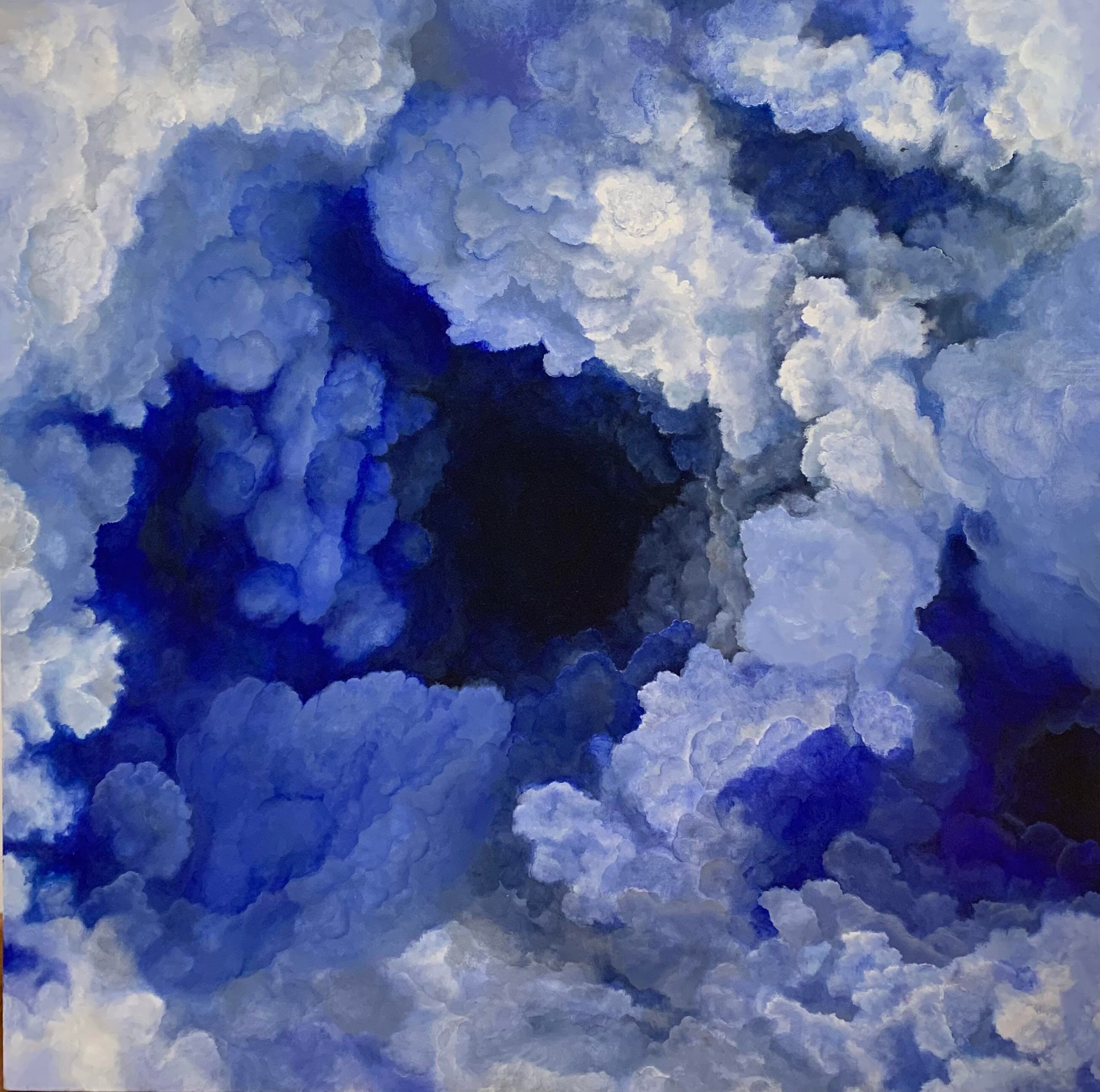 Un ejemplo elocuente de este ejercicio es la obra Allá (2019-2022), un fascinante túnel nuboso que atrae la visión del espectador hacia un lugar indeterminado y progresivamente oscuro. La maestría técnica en esta representación etérea constituye en sí misma un deleite visual. Sin embargo, está lejos de tratarse de una pintura de carácter decorativo o meramente efectista. La materia de las nubes, en permanente transformación en la obra de esta artista, reviste simbólicamente un carácter de espacio mental.