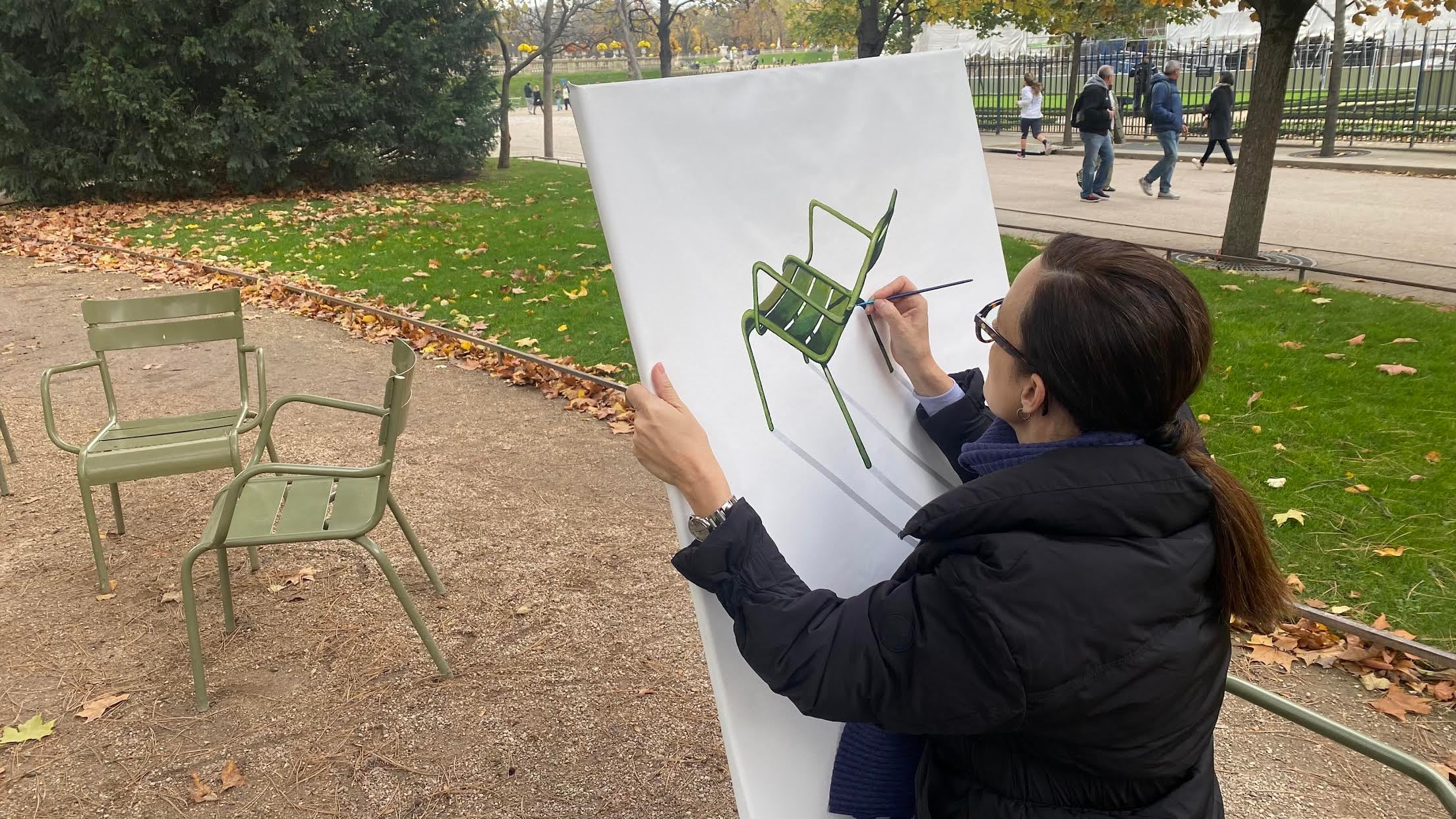 El espacio de su obra De espaldas (2022), voluntariamente asimilable a la nada, resulta enigmático por su sensación de vacío. El blanco borra las fuentes, los árboles y los conjuntos de flores que componen la realidad tangible del jardín, apuntando a la concreción de la pérdida. La imagen sostiene apenas un indicio: la silla verde de quien está, o más bien, estuvo en el parque. La sombra, presencia inmaterial, es una proyección de la ausencia.