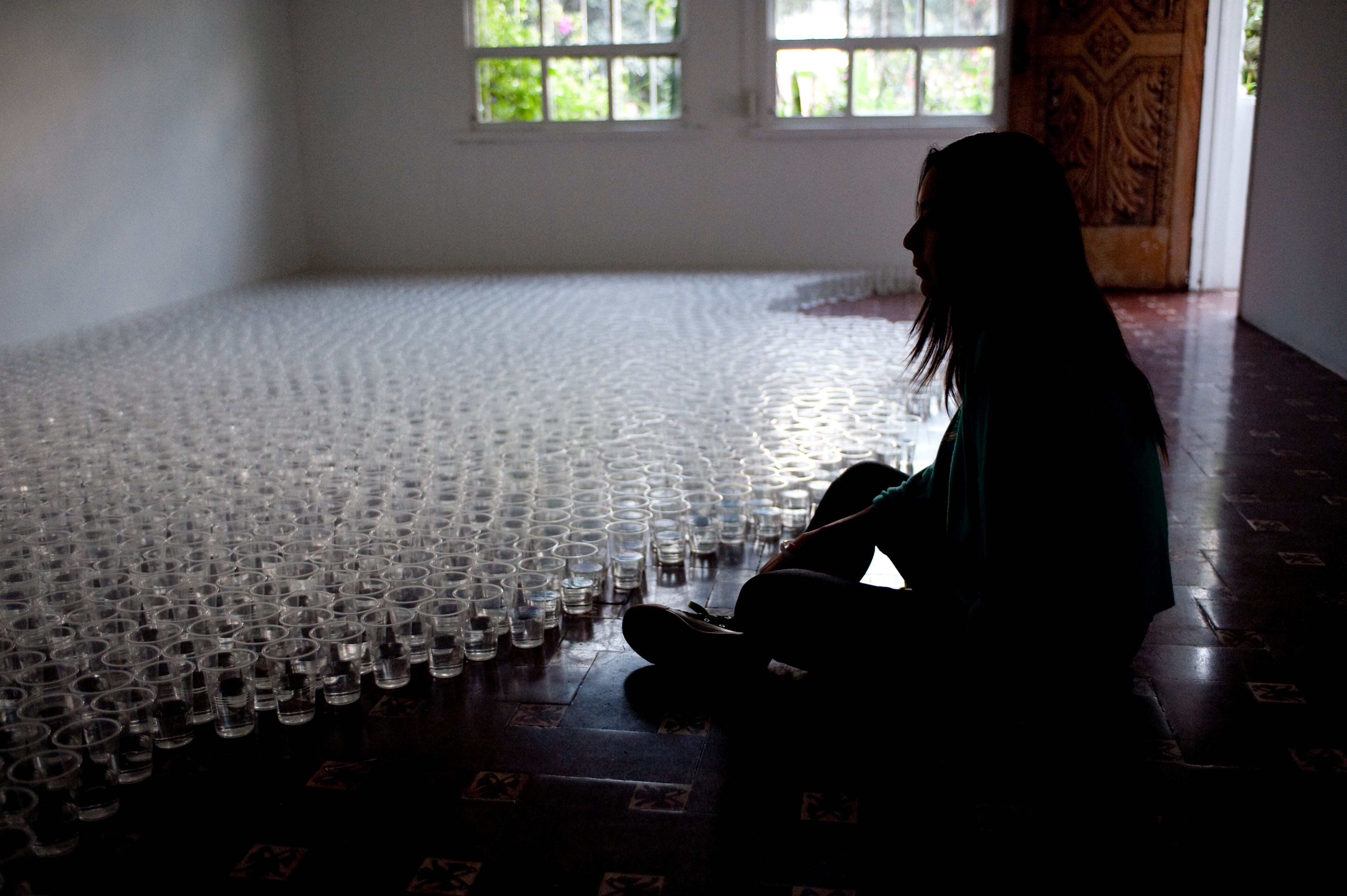 En el suelo, 10.000 vasos vacíos que Mimian iba llenando uno por uno, en trance, en silencio, ciega a los visitantes por su concentración y por su larga cabellera negra. Se contempla el agua como se contemplan ríos o mares, justo como el océano que las separó. Los vasos eran su tía materna Viola Chen: era ella pues su nombre chino, Chen Wuan-shuei, quiere decir “diez mil aguas”.