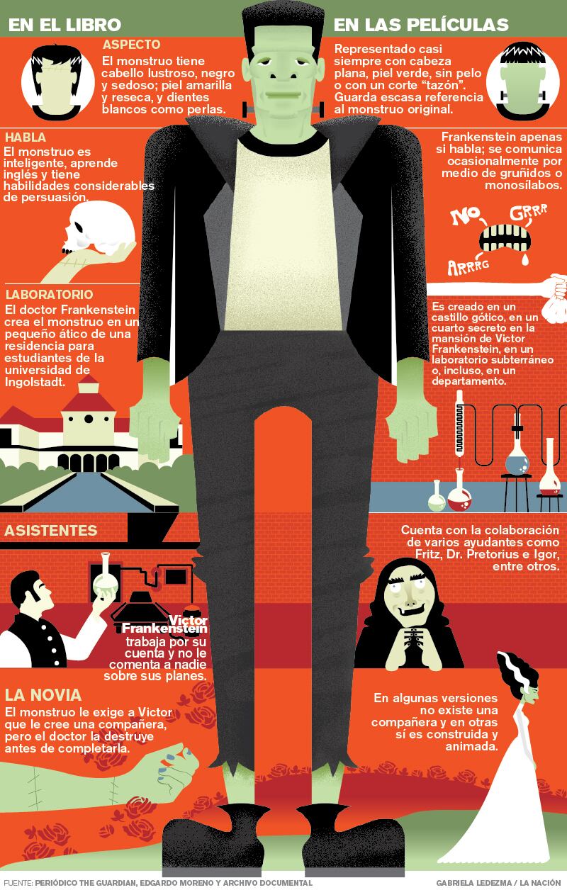 Aunque en el imaginario colectivo, el monstruo de Frankenstein es revivido mediante electricidad, en la novela de Shelley no se mencionan detalles sobre los experimentos que le dieron vida. Aun así, la mayoría de las películas y otras obras conservan la idea central sobre un gigante hecho a partir de un amasijo de cadáveres, que tiene sed de venganza por haber sido rechazado; detesta al doctor Frankenstein, su creador, quien vive agobiado por el remordimiento.
