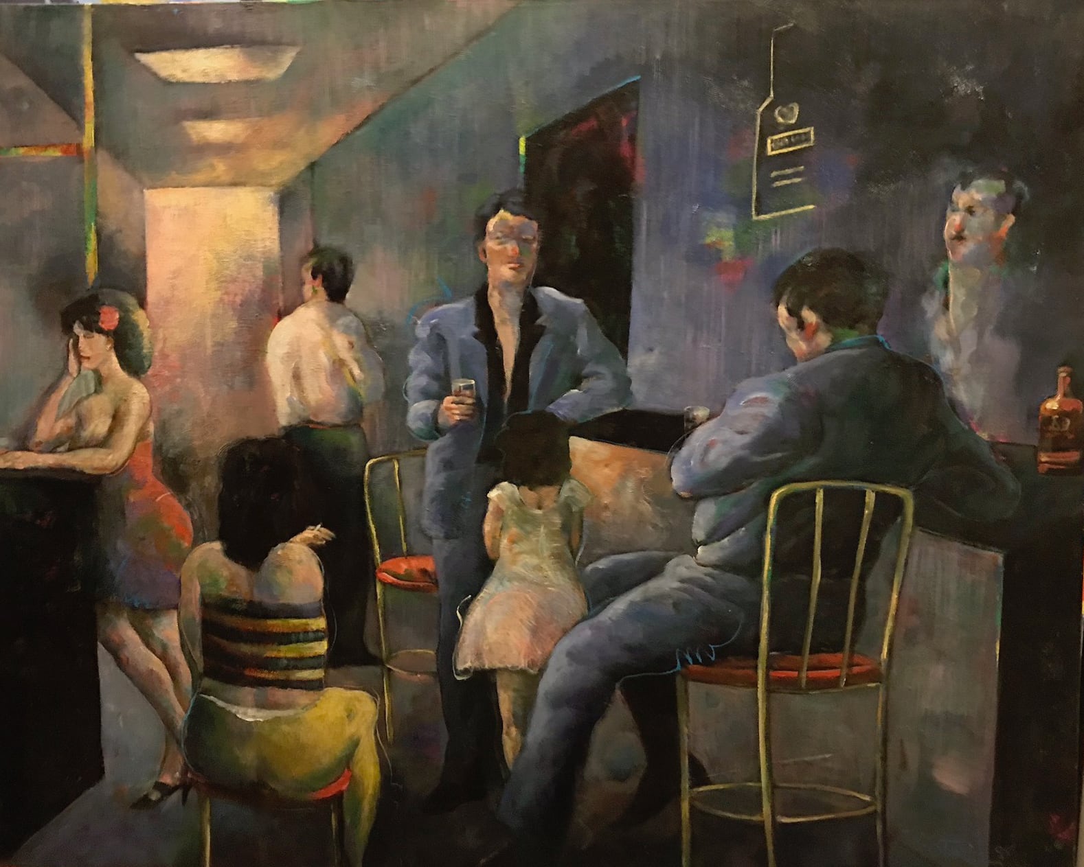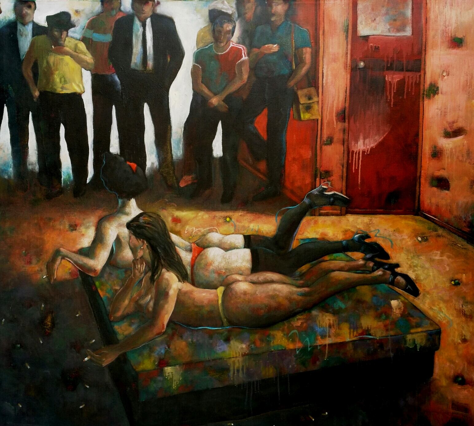 La narrativa de esta obra sugiere, en un primer registro, el testimonio de una situación de prostitución infantil. La perspectiva imposible de un espacio que se encoge hacia la puerta refuerza la idea de encierro, asimilando el recinto a un sórdido callejón. La impasibilidad de los otros personajes ante la presencia de la niña en este lugar es un comentario sobre indiferencia social a las transacciones que suceden al margen, en los espacios oscuros y mustios de la noche.