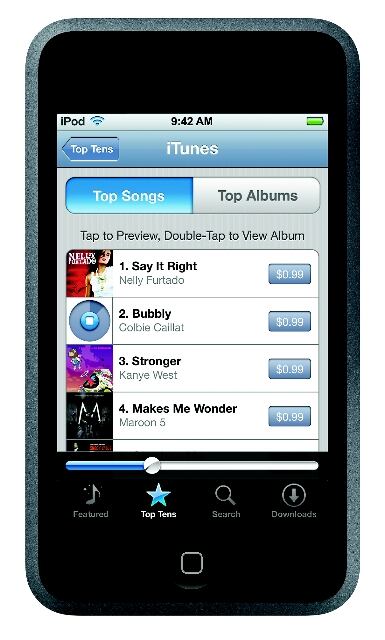 Apple es una empresa pionera en la venta de música digital. El debut de su tienda de música iTunes en 2003 dio a las personas una manera fácil y legal de obtener música para sus iPods. Lo que comenzó con un catálogo de cerca de 200.000 canciones ha crecido a decenas de millones de temas. Actualmente iTunes es el mayor minorista estadounidense de música.