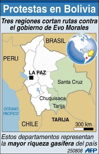 Mientras arrecian las protestas cívicas en las tres regiones -que concentran la mayoría de las reservas de gas, estimadas en 1,36 billones de metros cúbicos, las segundas de la región después de Venezuela- los prefectos rebeldes de Santa Cruz, Beni, Pando, Chuquisaca y Tarija retomaron este martes la propuesta de diálogo.