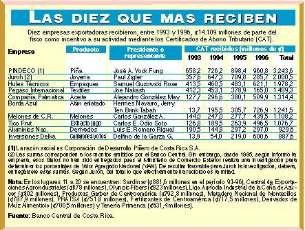 Aunque la información de los nombres de las empresas exportadoras receptoras de CAT ha sido calificada como confidencial en los últimos años por las autoridades de Comercio Exterior, La Nación obtuvo una copia de un listado con los montos emitidos por el Banco Central por este concepto, entre 1993 y 1996, para un total de ¢62.930 millones.