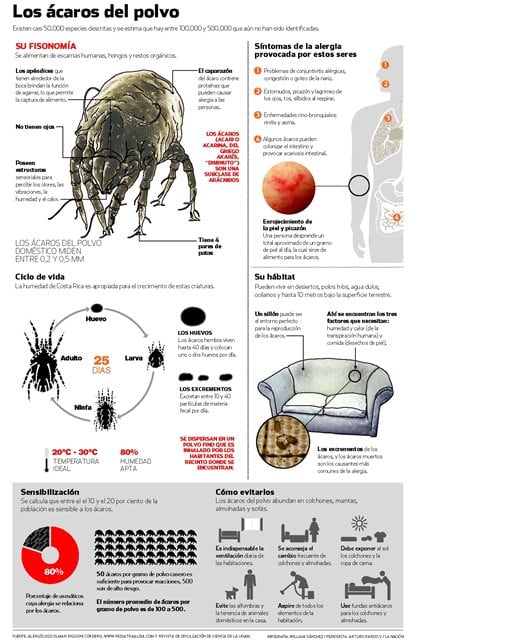 “Además, muchas de esas partículas cuentan con capacidad enzimática propia; es decir, sirven como enzimas en los organismos que las producen”, explica el médico alergólogo Olman Riggioni. “La proximidad con la que se encuentran (los ácaros) en los nichos de la vivienda del ser humano, los hace candidatos ideales para producir problemas”, agrega.