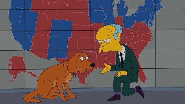 El jefe de Homero Simpson trae a la habitación un perro llamado Seamus y lo obliga a elegir entre dos hombres disfrazados de candidatos: “Meat” Romney, quien le ofrece un jugoso bistec, y “Broccoli” Obama, quien tiene sobre una bandeja dos raquíticos vegetales.
