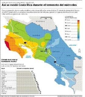 La aceleración registrada el miércoles en Nicoya fue de 239,67 cm/s², mientras la de Fraijanes fue de 284,06 cm/s². La mayor aceleración en el país se registró en Santa Cruz, con 563,02 cm/s².