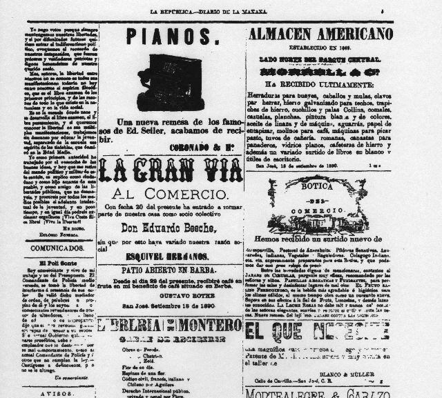Ejemplo de lo antes dicho se presentó en La República del 31 de octubre de 1890 (n.° 1259), que incluyó este aviso: “La Fábrica de Pianos DE ED. SEILER LIEGNITZ tiene de venta en Puntarenas 9 instrumentos de varios modelos construidos con el mayor esmero y aparentes para el clima de Costa Rica. Dirigirse á Horacio Lutschauning”.