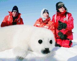 Paul McCartney y su esposa Heather visitaron hoy los hielos flotantes que cubren el golfo de San Lorenzo, en el extremo oeste del país, donde decenas de miles de focas arpa paren sus cachorros e esta época del año.