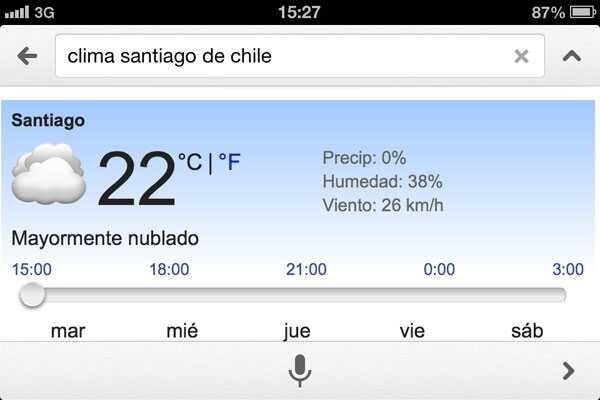 Aunque no es Google Now, el sistema de administración de datos usado en Android Jelly Bean, la nueva app de iOS sí incorpora la búsqueda por voz, que va reconociendo lo que usuario dice casi en tiempo real, entregando una respuesta rápida y con sorprendentes grados de precisión.