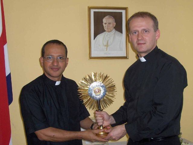 El sacerdote polaco Derek Ras ingresó a nuestro país el domingo pasado con la reliquia, que procede de Cracovia, la ciudad natal de Juan Pablo II, y la mantendrá en custodia hasta el momento de la instalación en Paraíso.