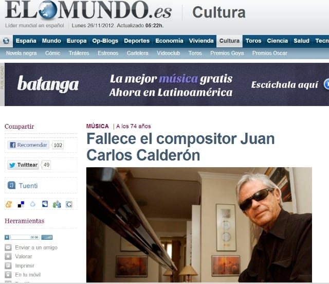 San José (Redacción). El compositor e intérprete español Juan Carlos Calderón falleció, el domingo por la noche, en una clínica en Madrid tras sufrir insuficiencia cardiaca y estar cuatro días hospitalizado, informaron sus familiares al diario El Mundo.