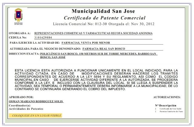 San José (Redacción). Olman Arguedas Rojas obtuvo su patente comercial para abrir una farmacia en Paseo Colón en tan solo tres días utilizando el sistema de Internet www.crearempresa.go.cr , según informó la oficina de Gobierno Digital.